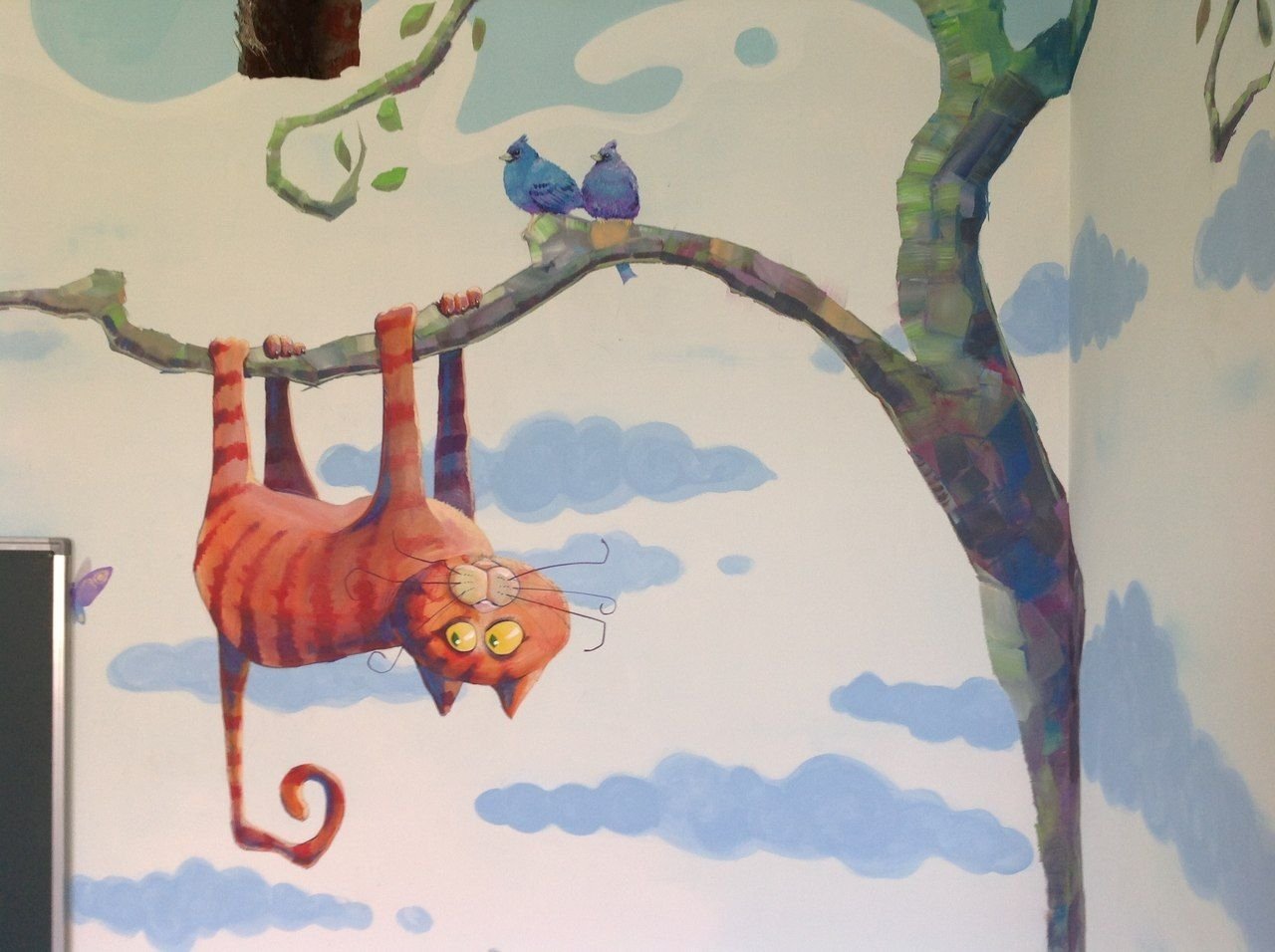 Нарисованная картина кота на дереве лежачего