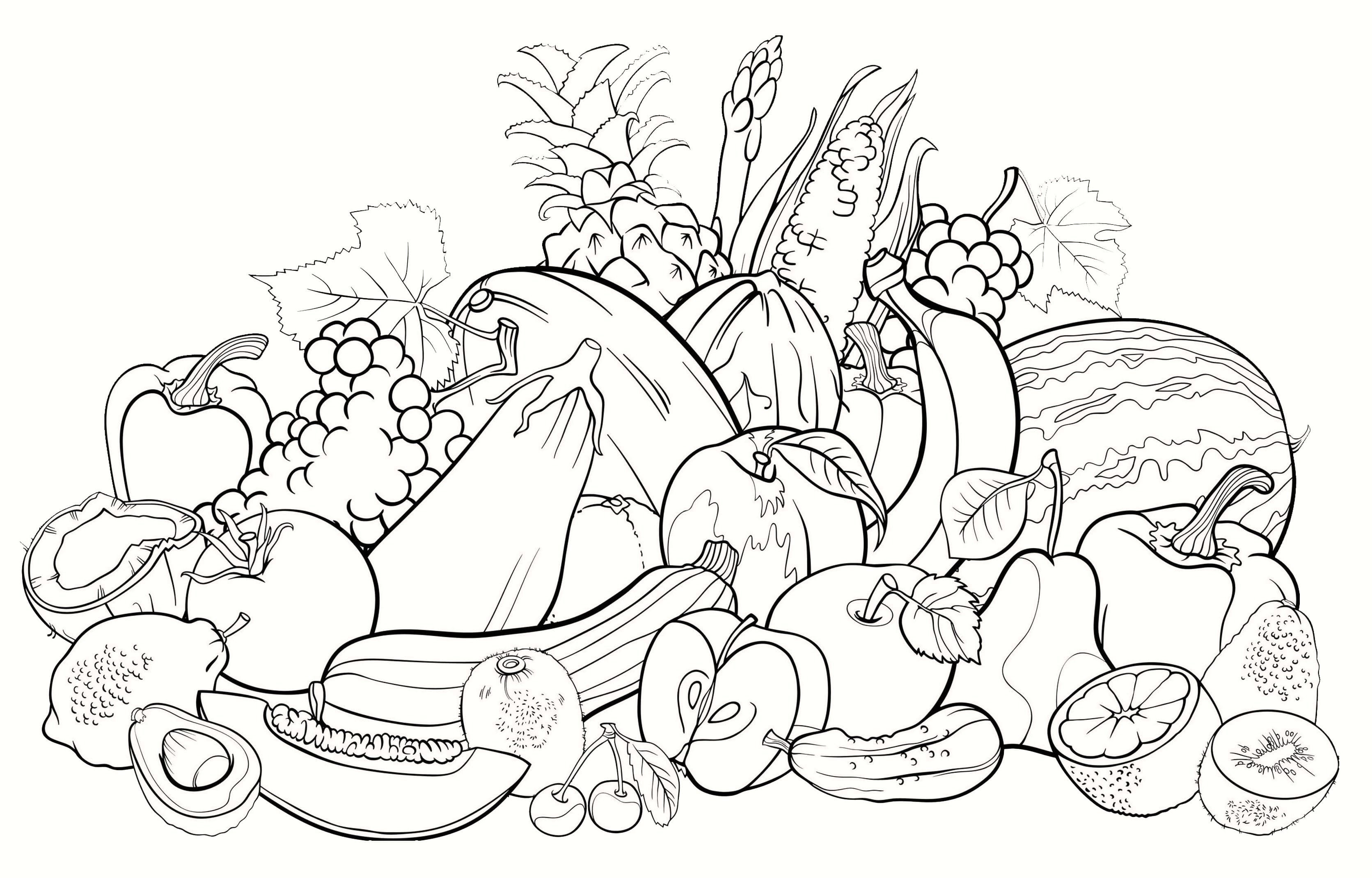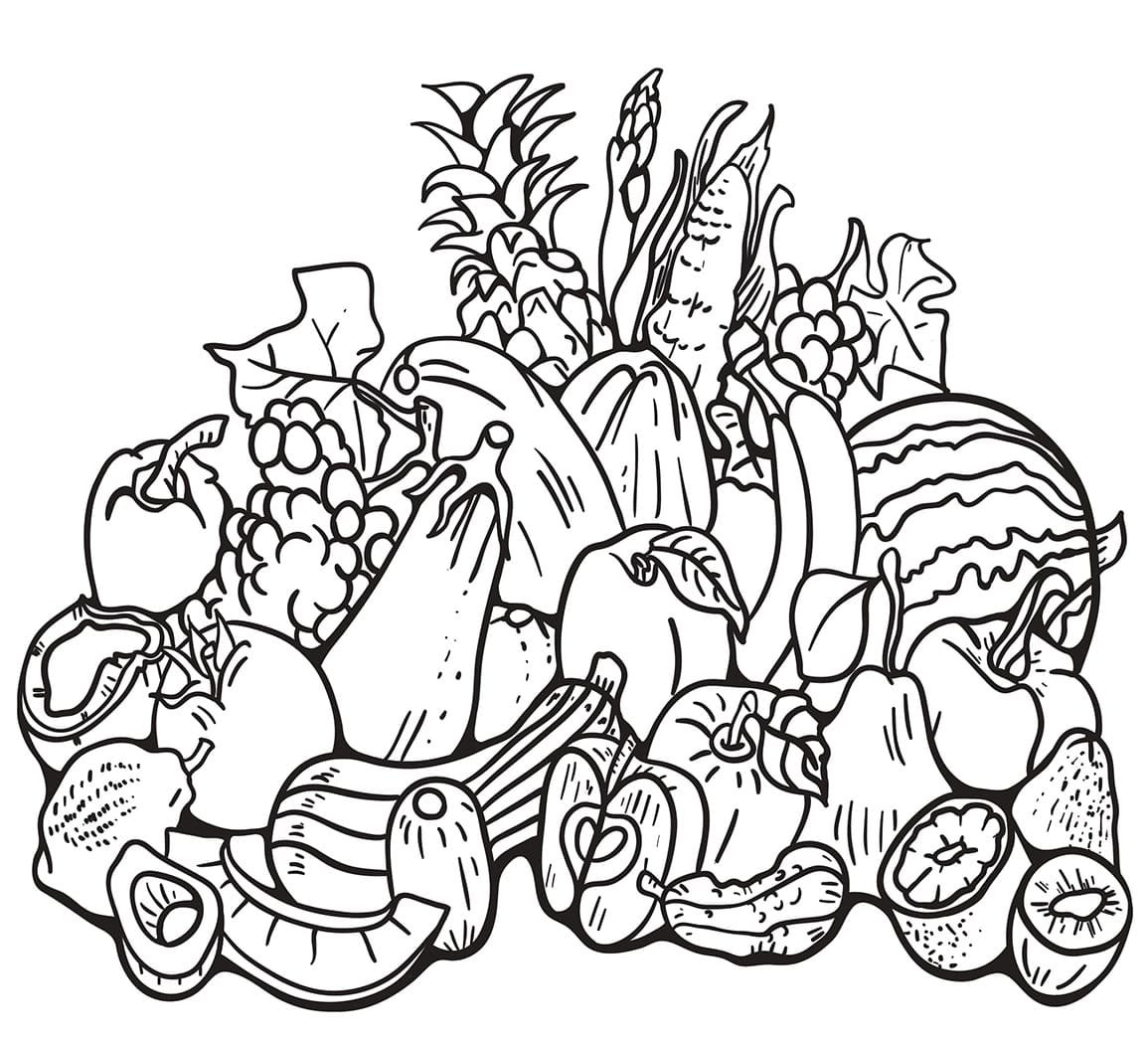 Раскраска корзина с фруктами и овощами