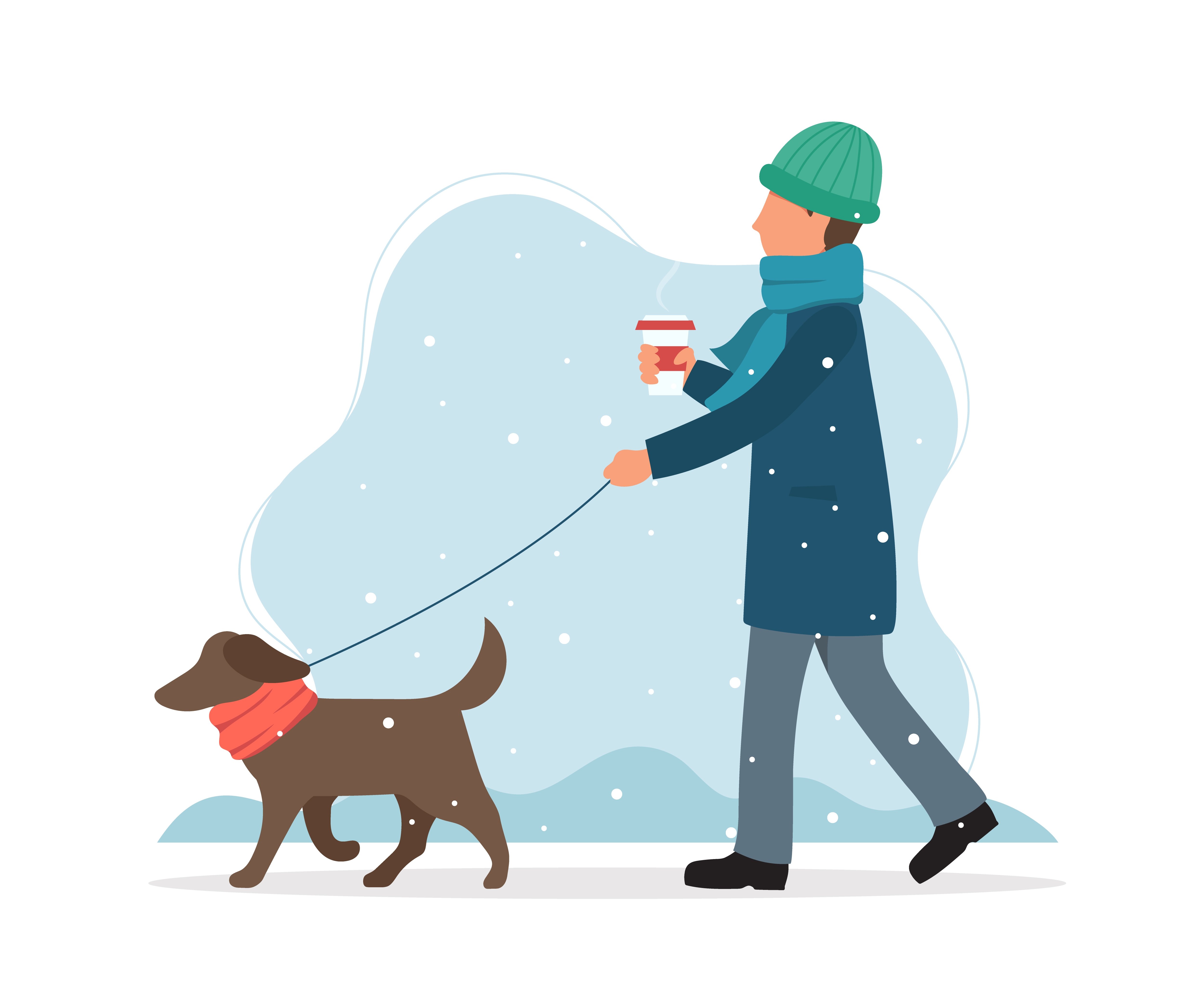 Человек гуляет с собакой зимой