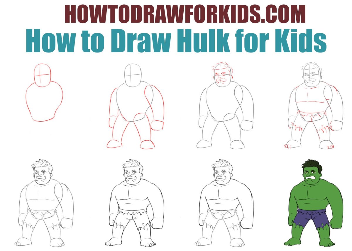 Нарисовать Халка поэтапно карандашом для детей