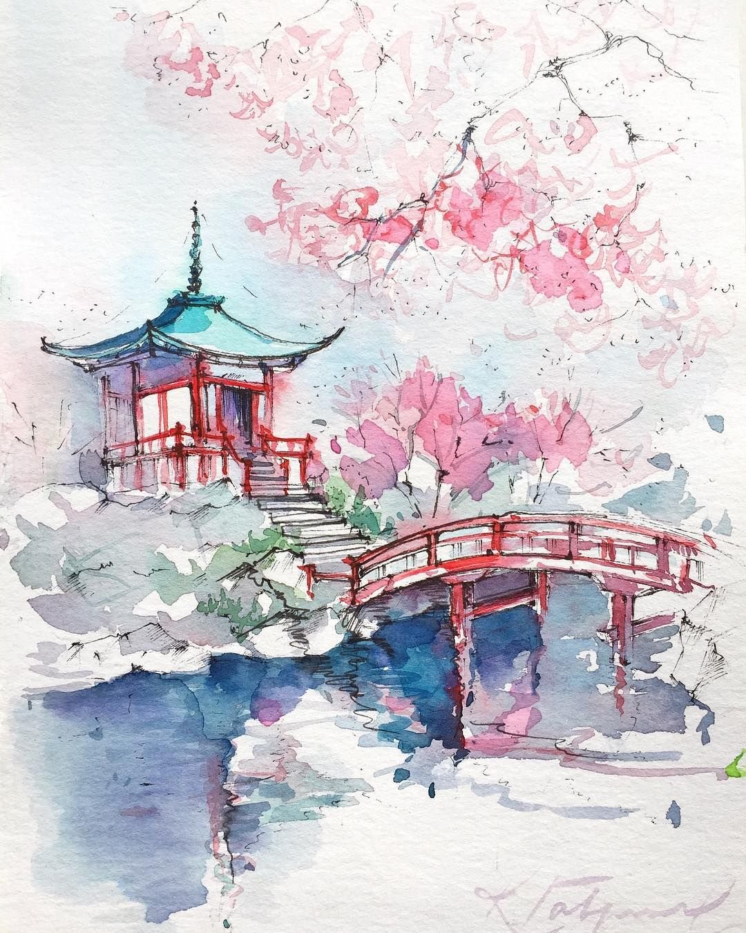 Китайская пагода акварелью пейзажи