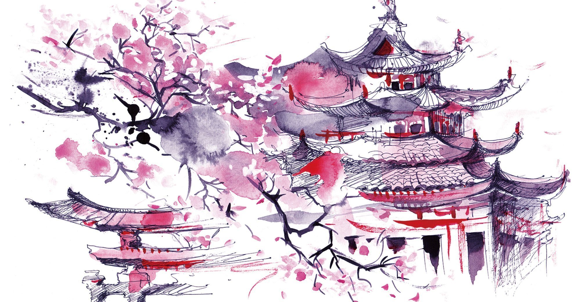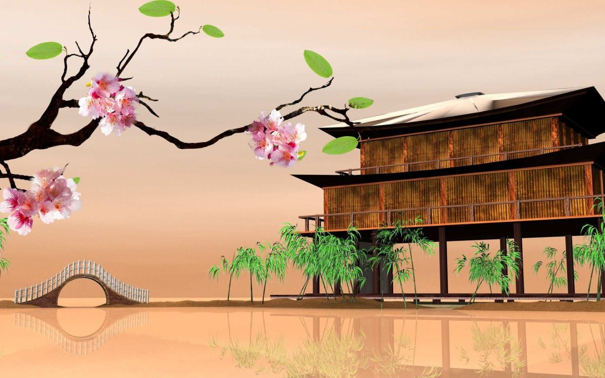 Японский дом с сакурой рисунок