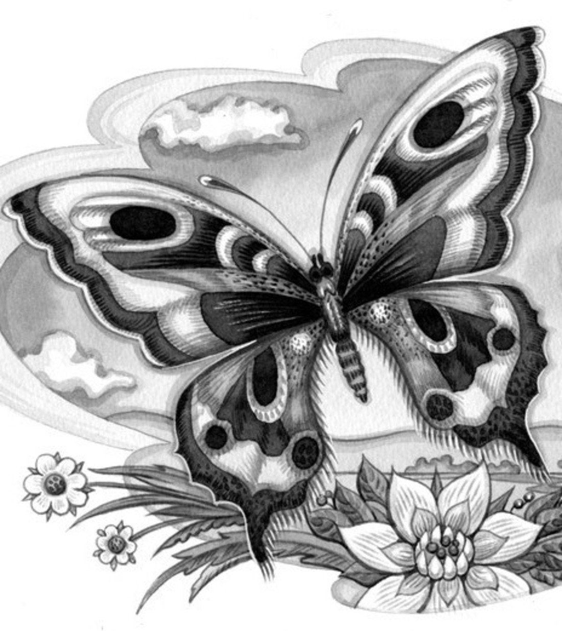 Раскраска черно белая цветы бабочка