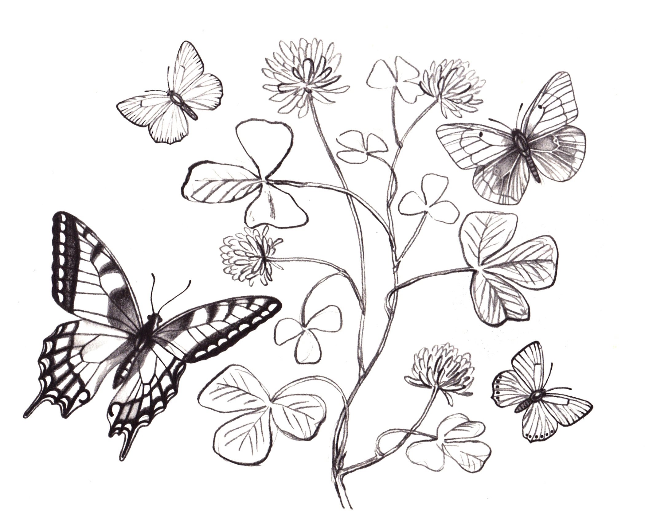 Красивые цветы с бабочками карандашом