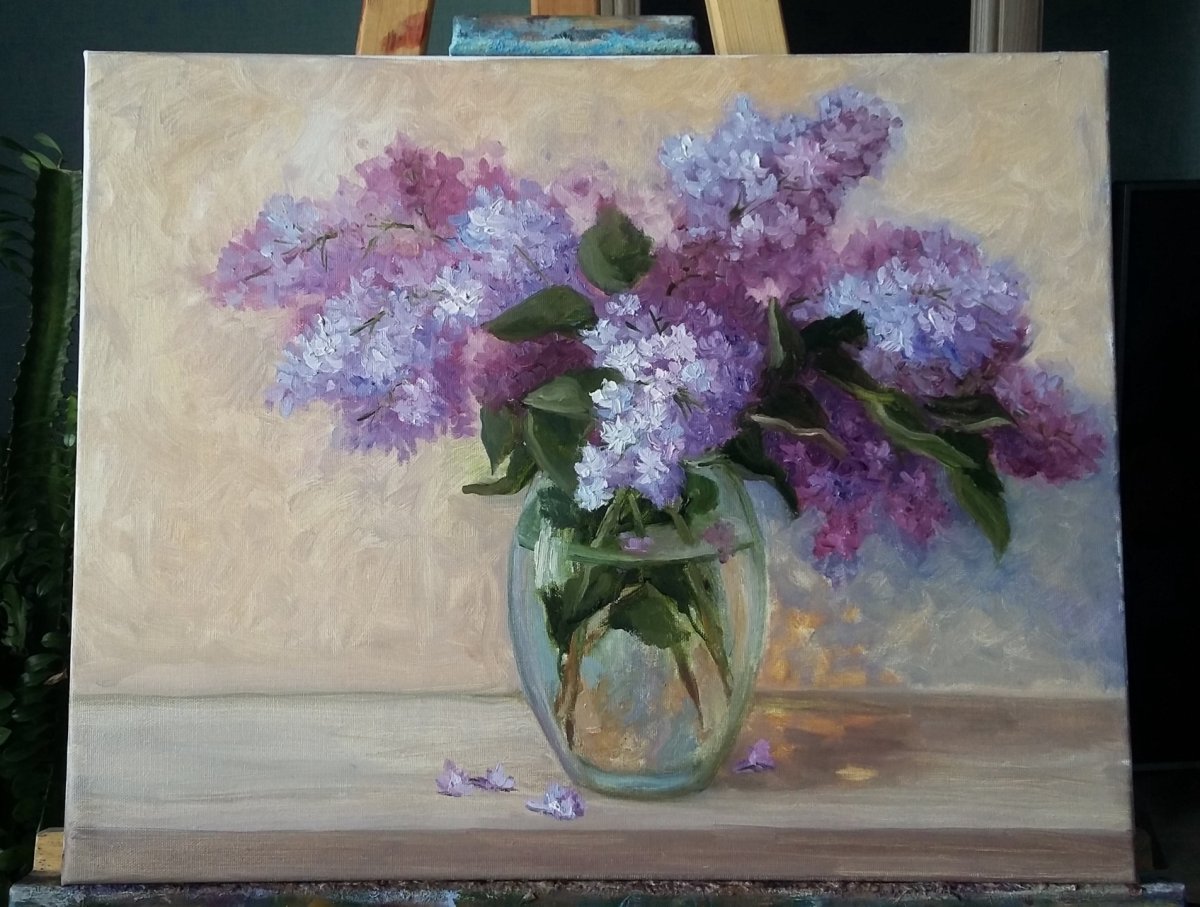 Сирень в стеклянной вазе маслом