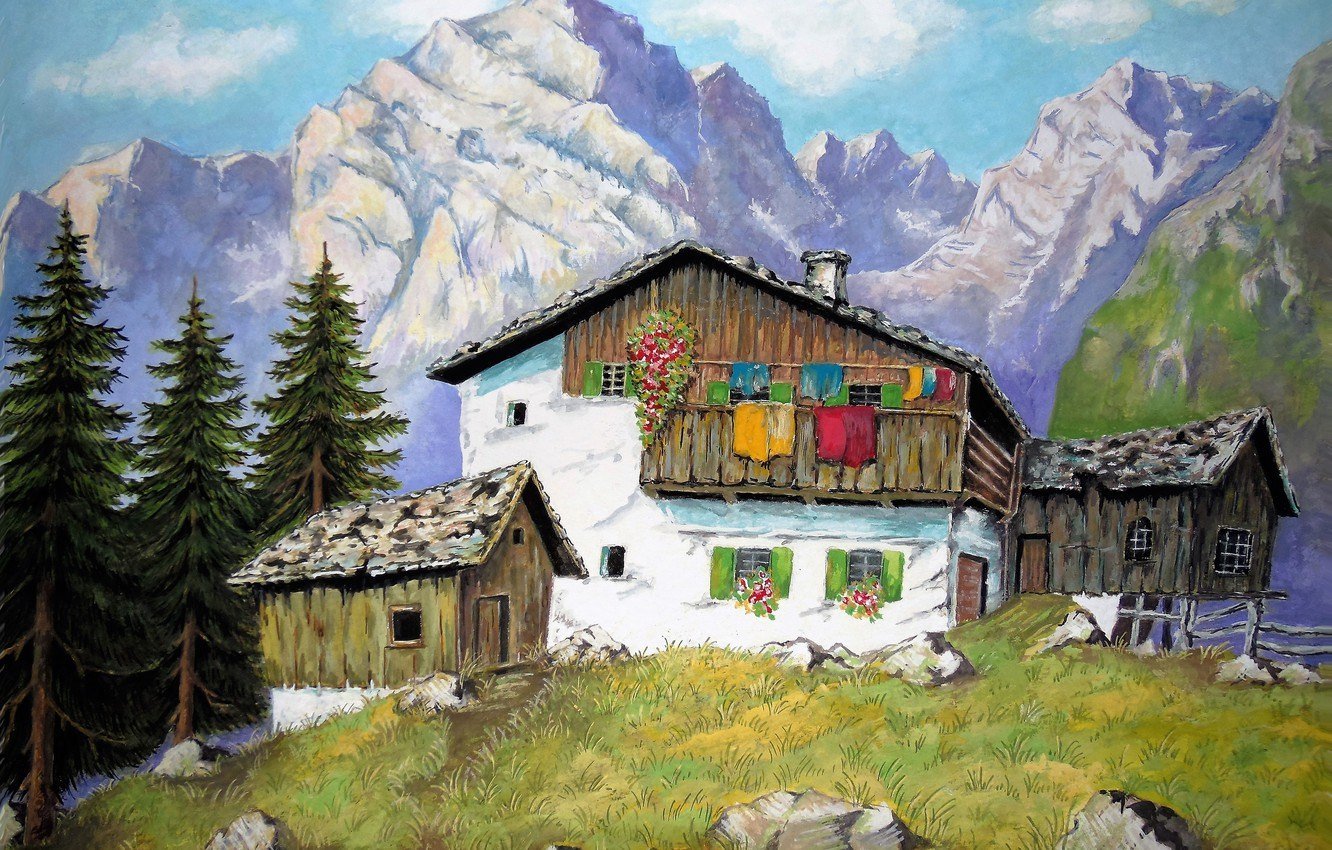 Домик в горах акварель