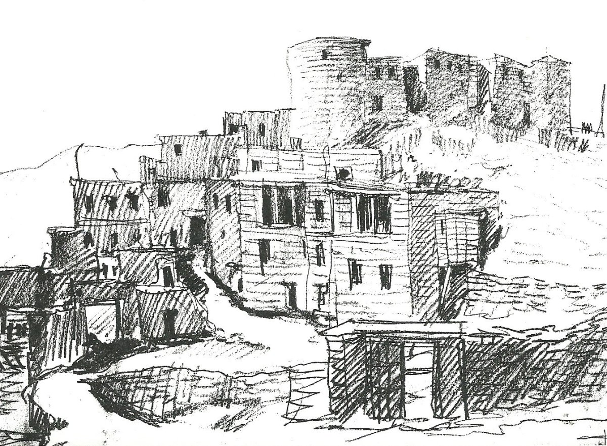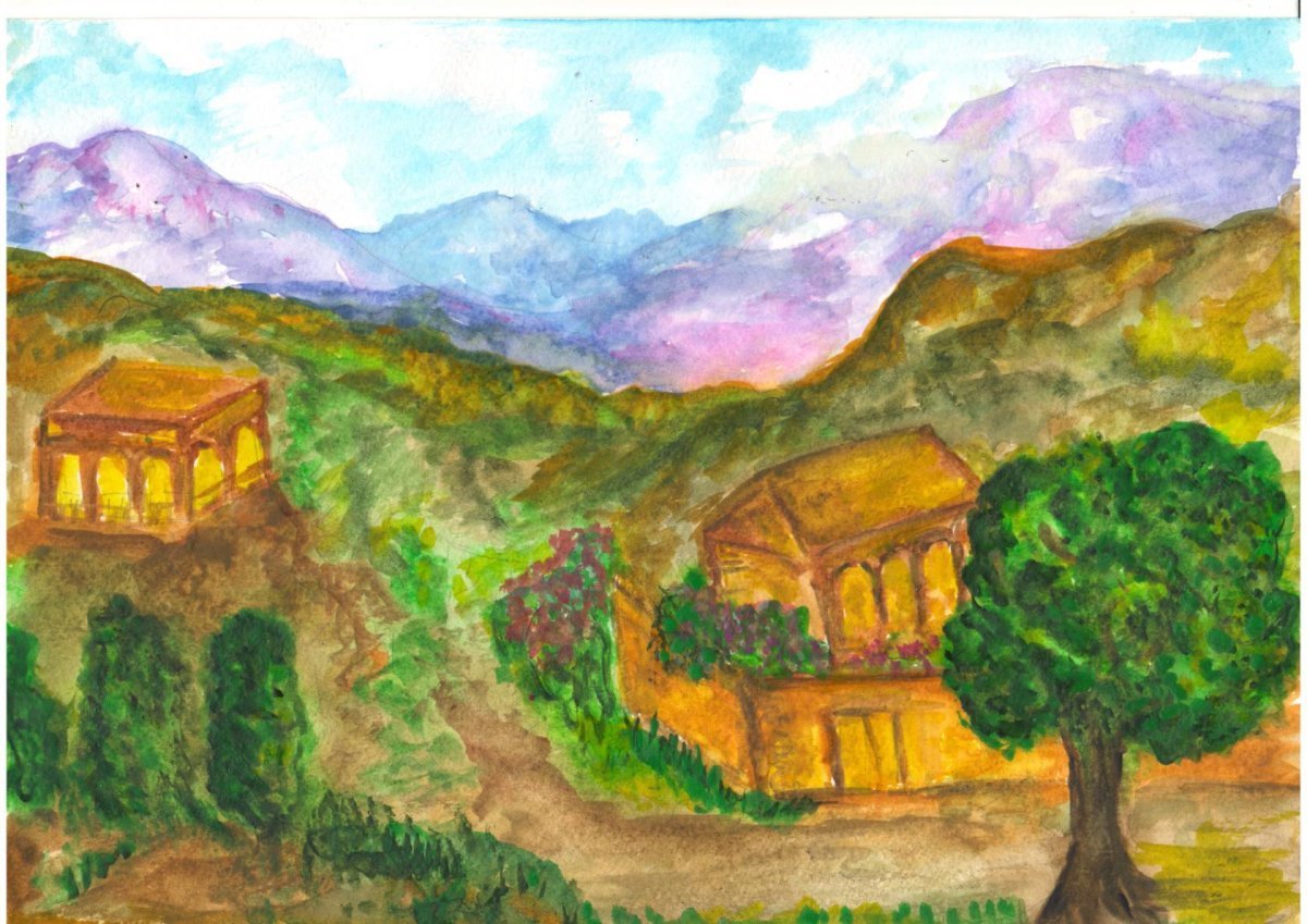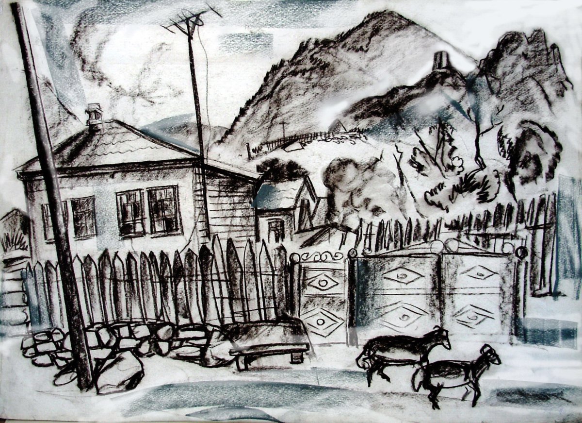 Рисунок аул в горах Кавказская сакля