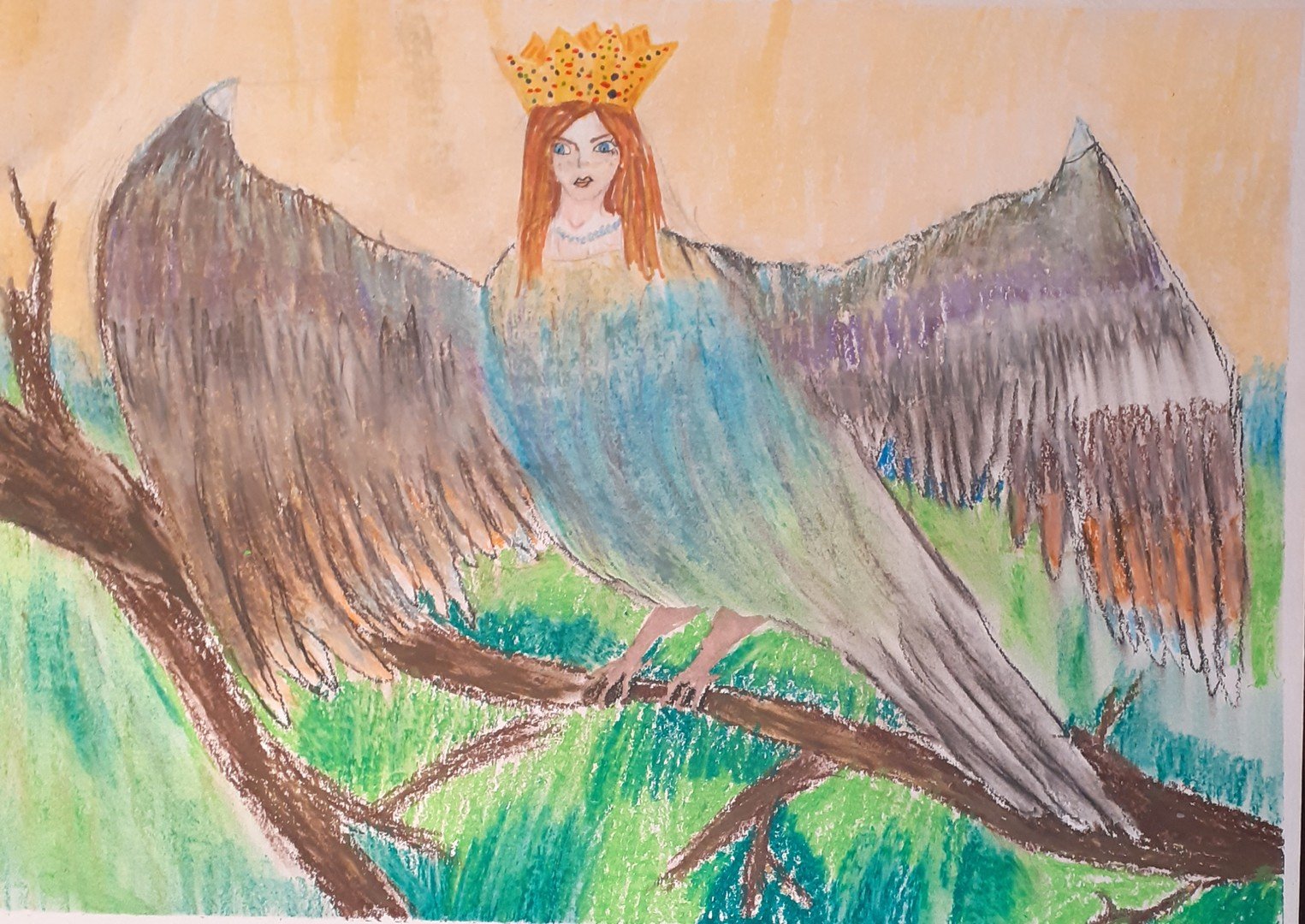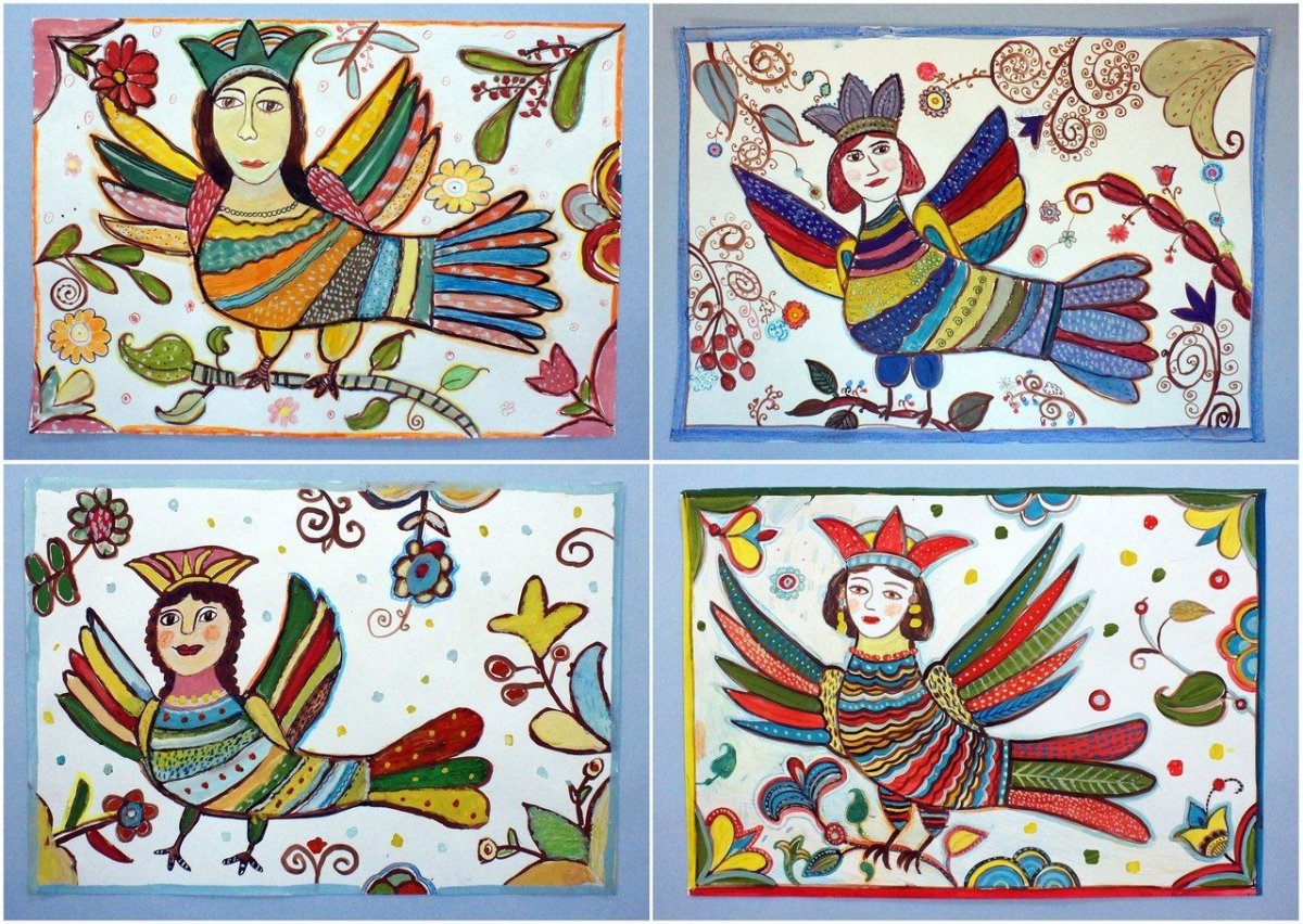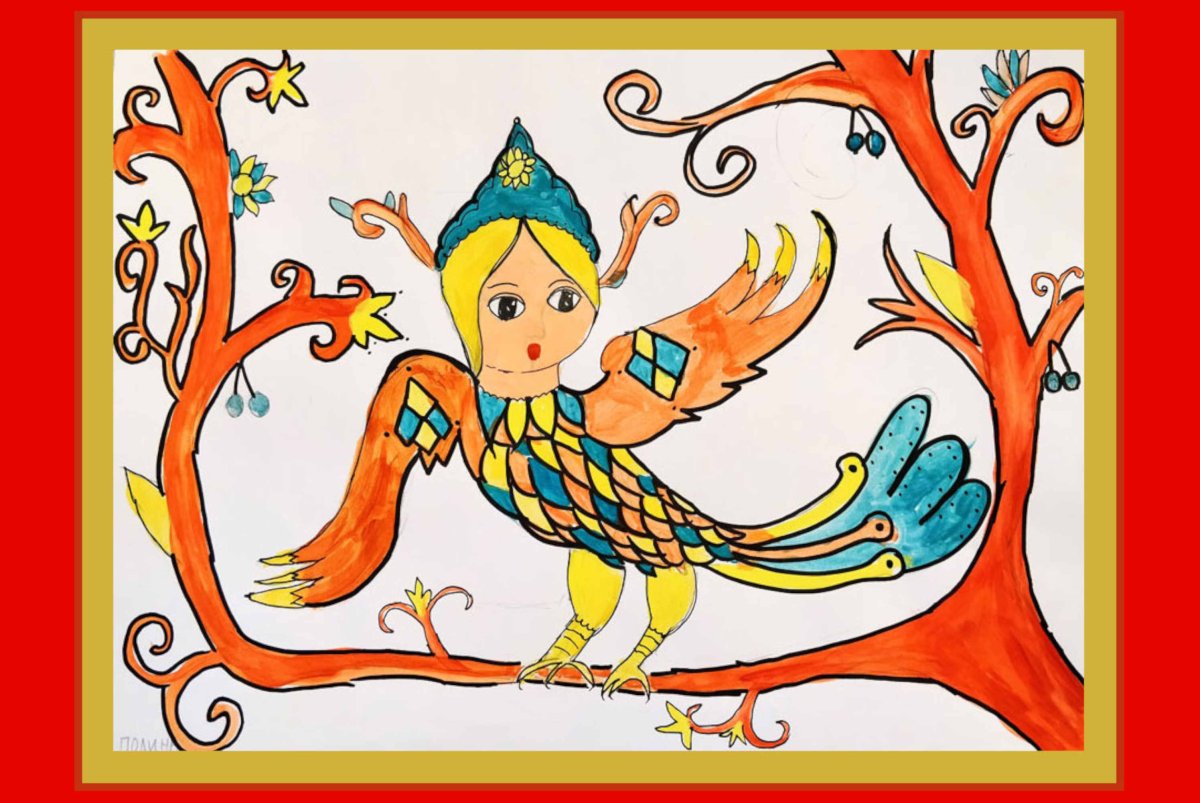 Детский рисунок птицы алконост в изостудии 2 класс