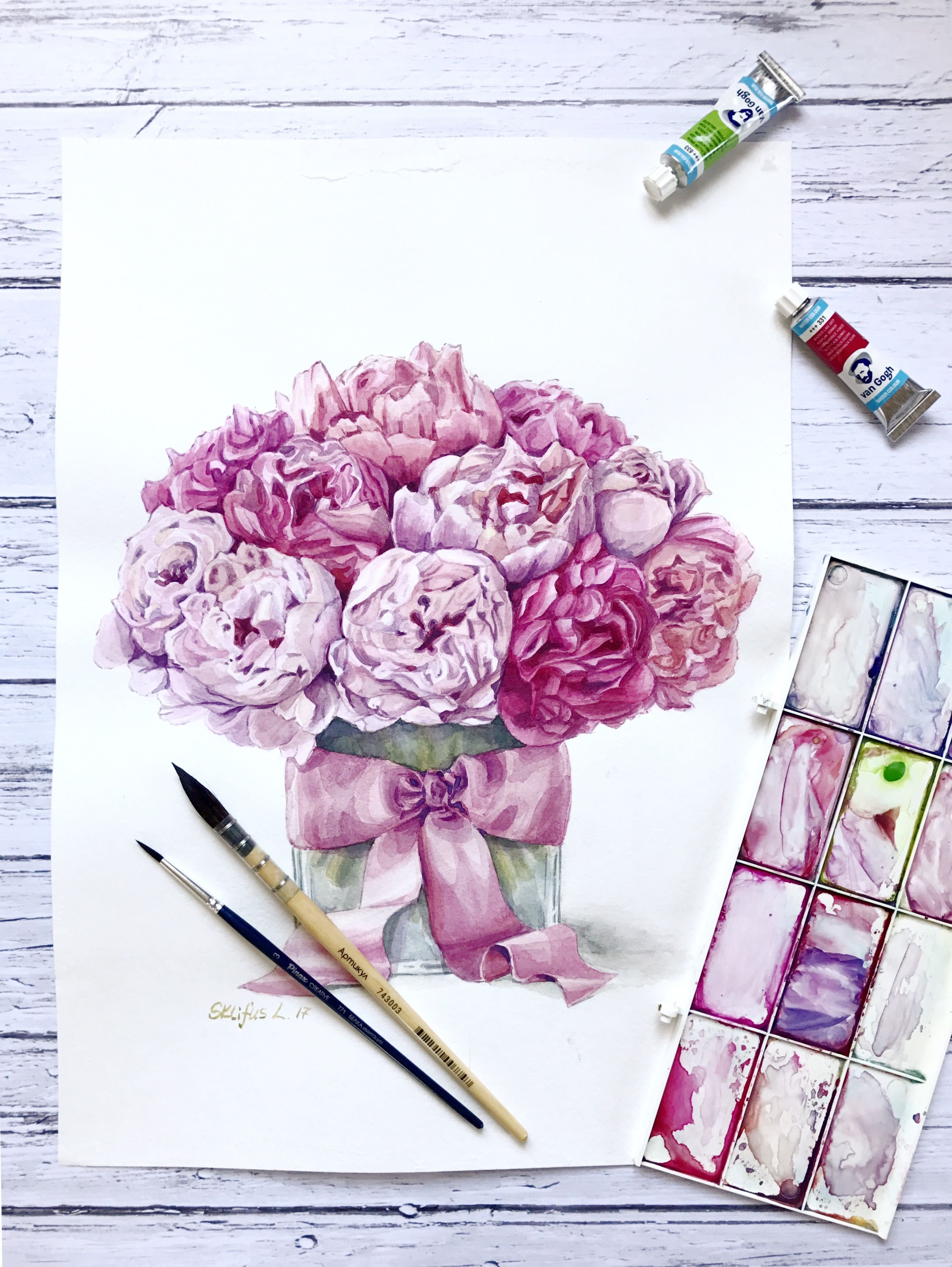 Пионы скетчинг акварель