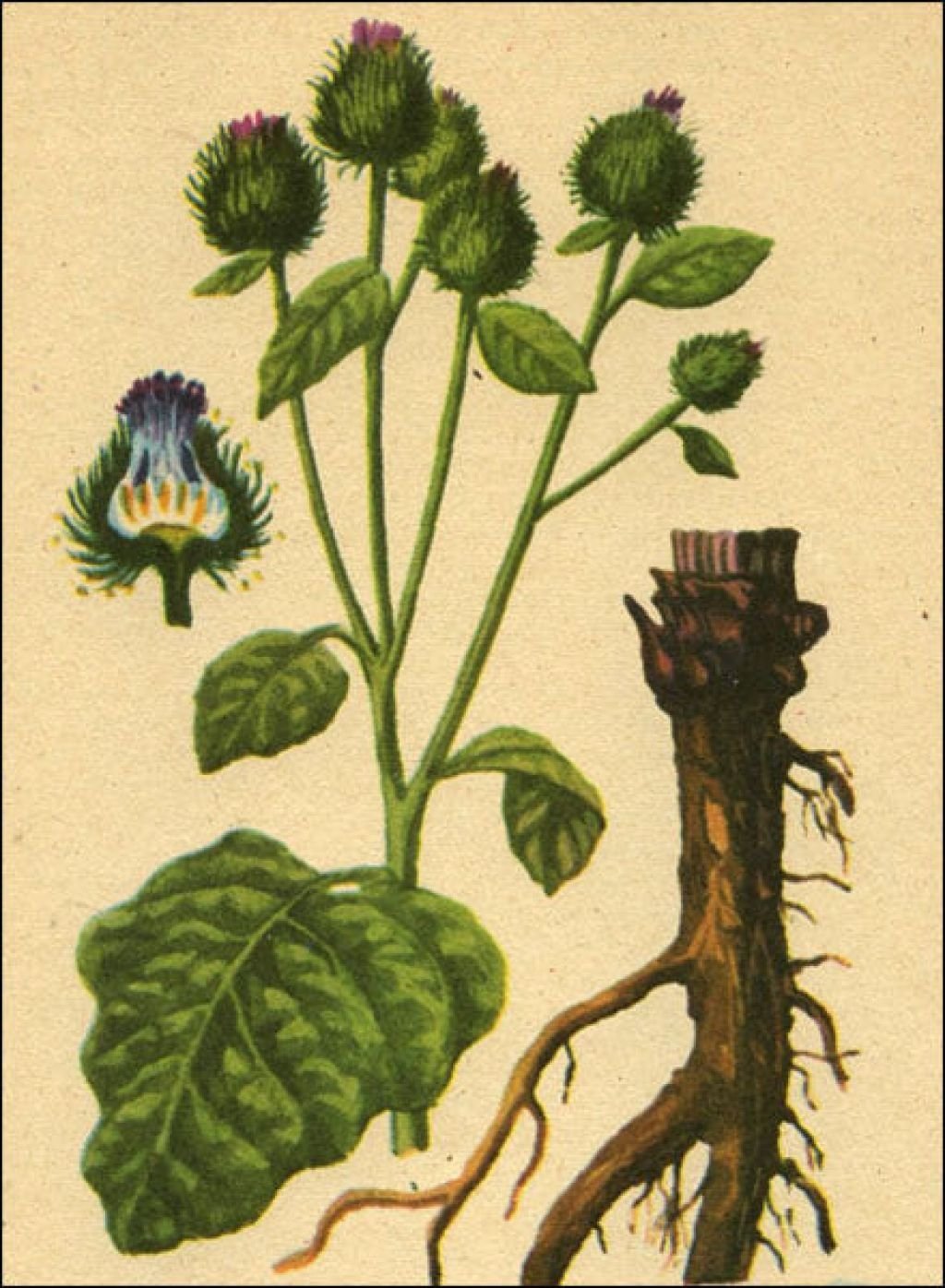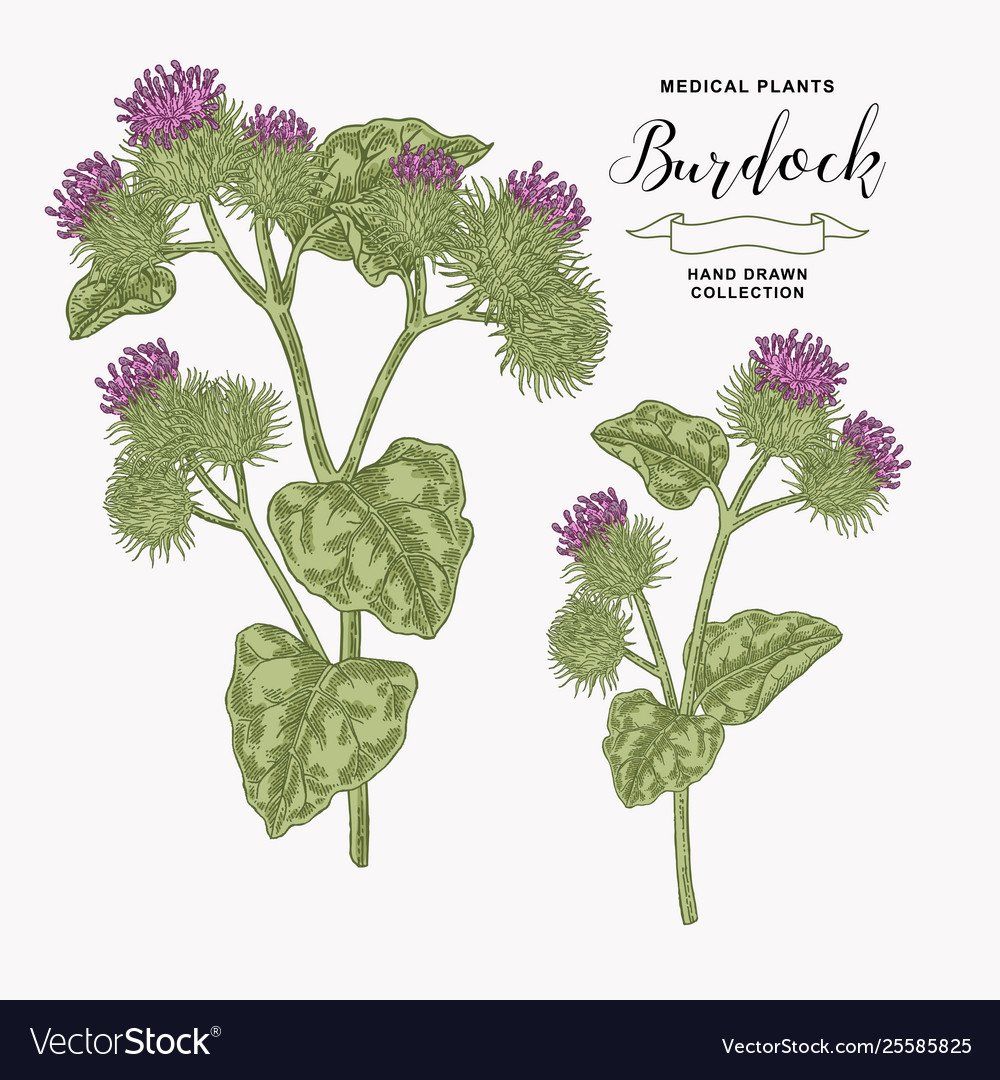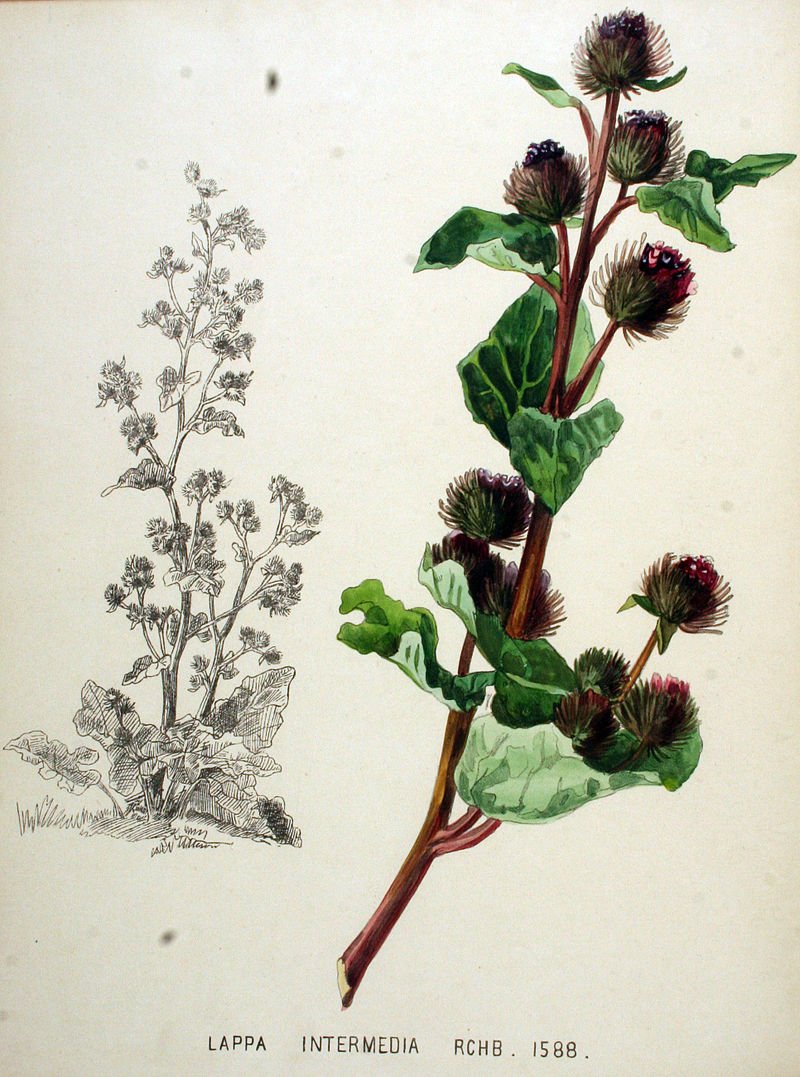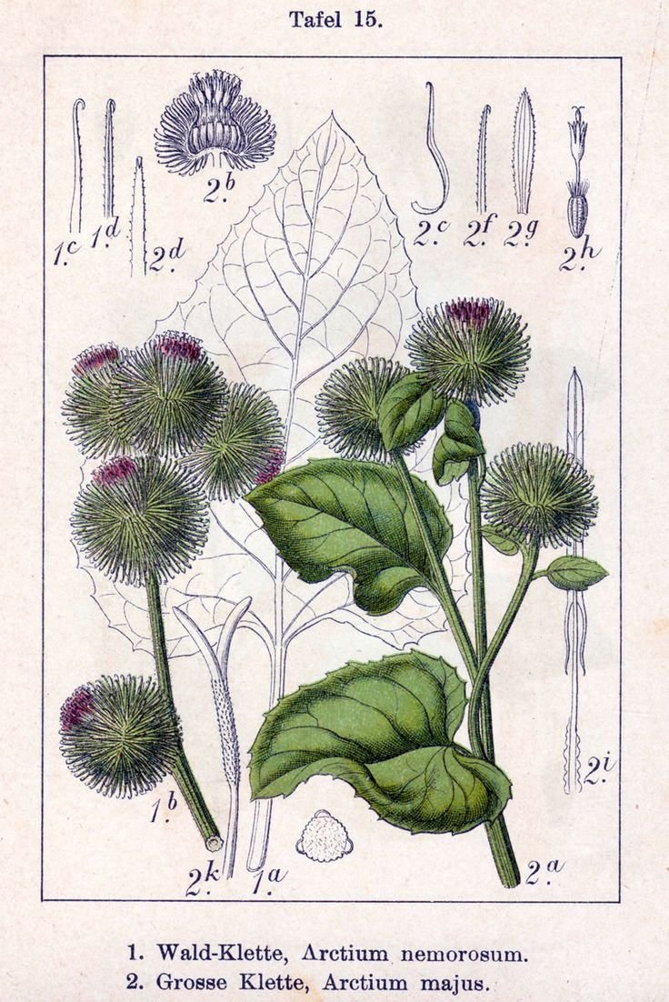 Лопух большой репейник Ботаническая иллюстрация