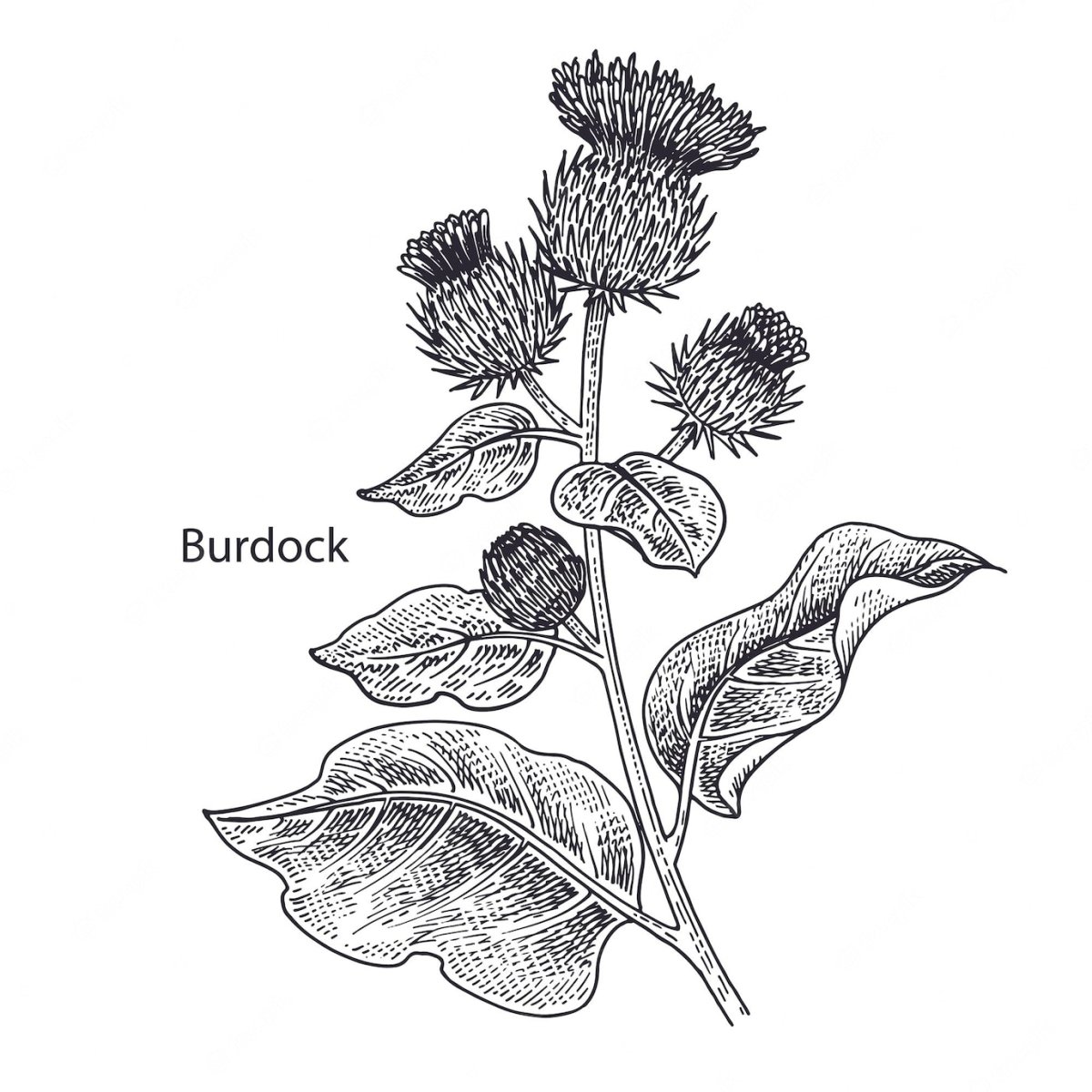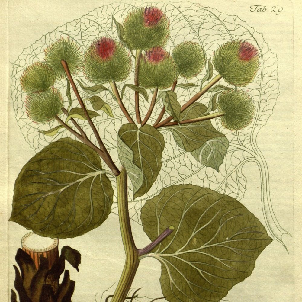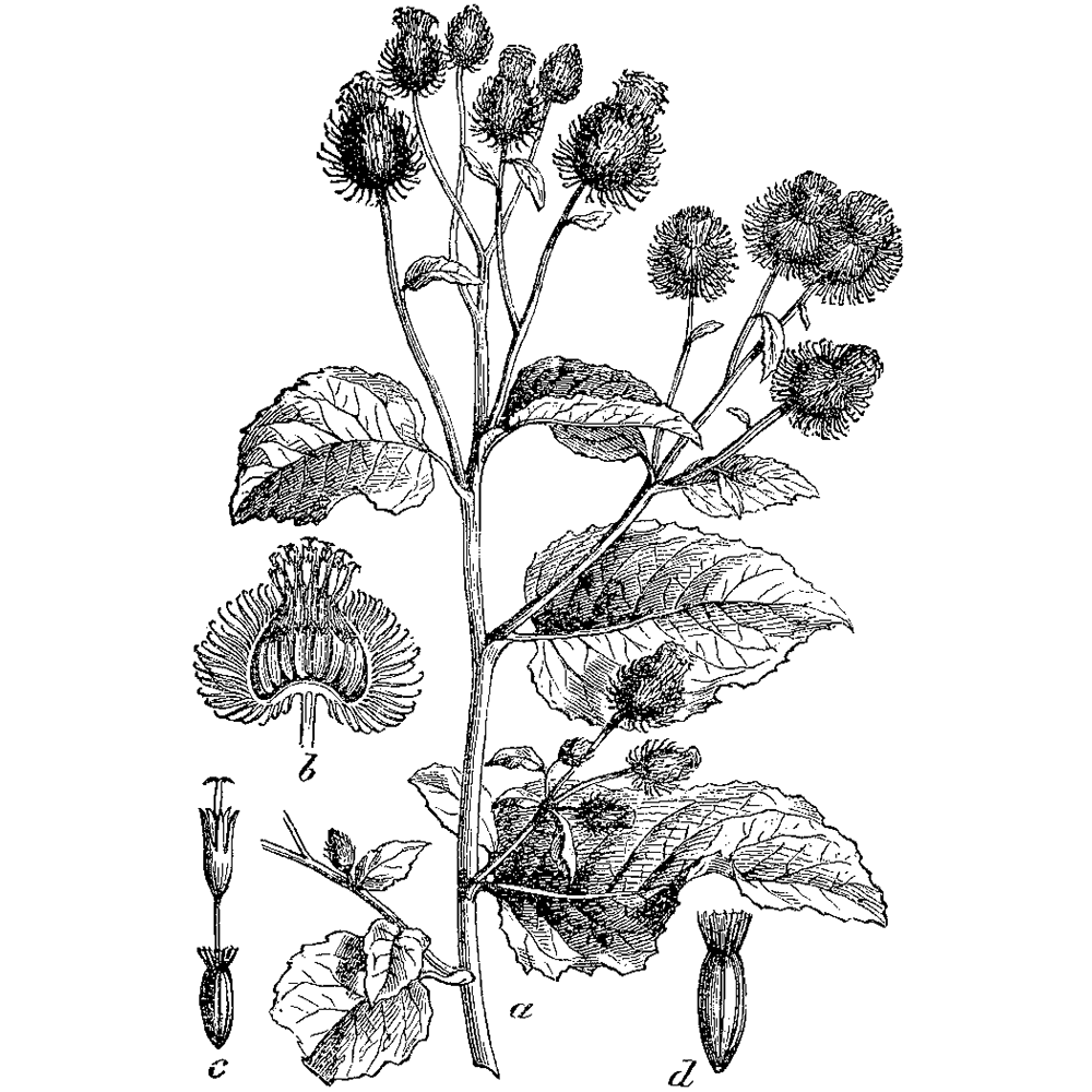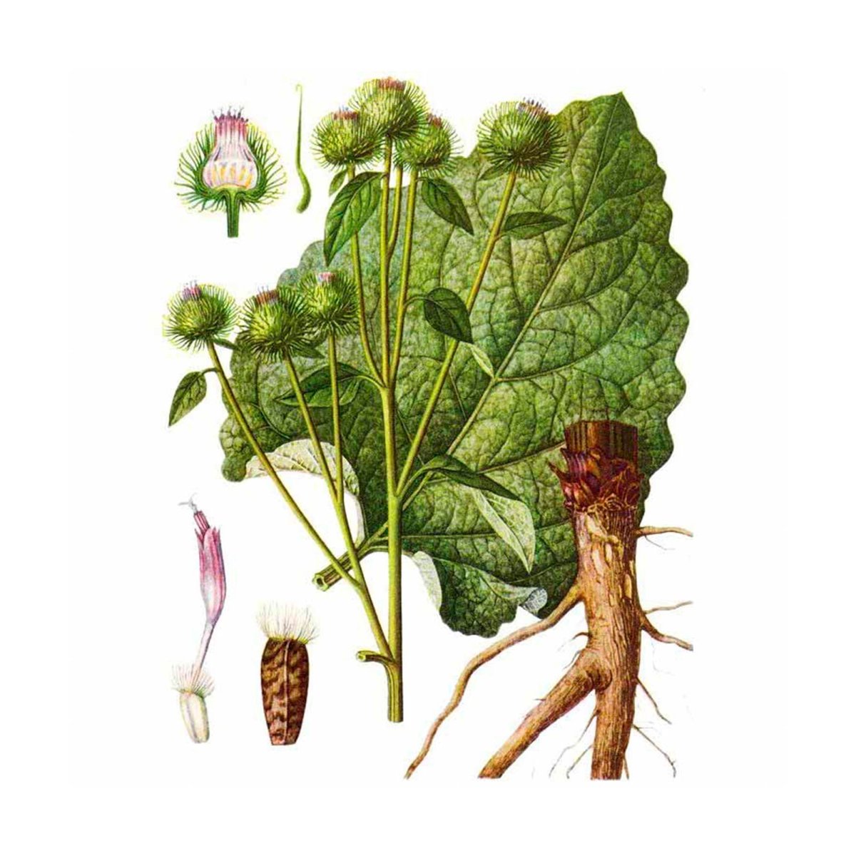 Лопух большой репейник Ботаническая иллюстрация