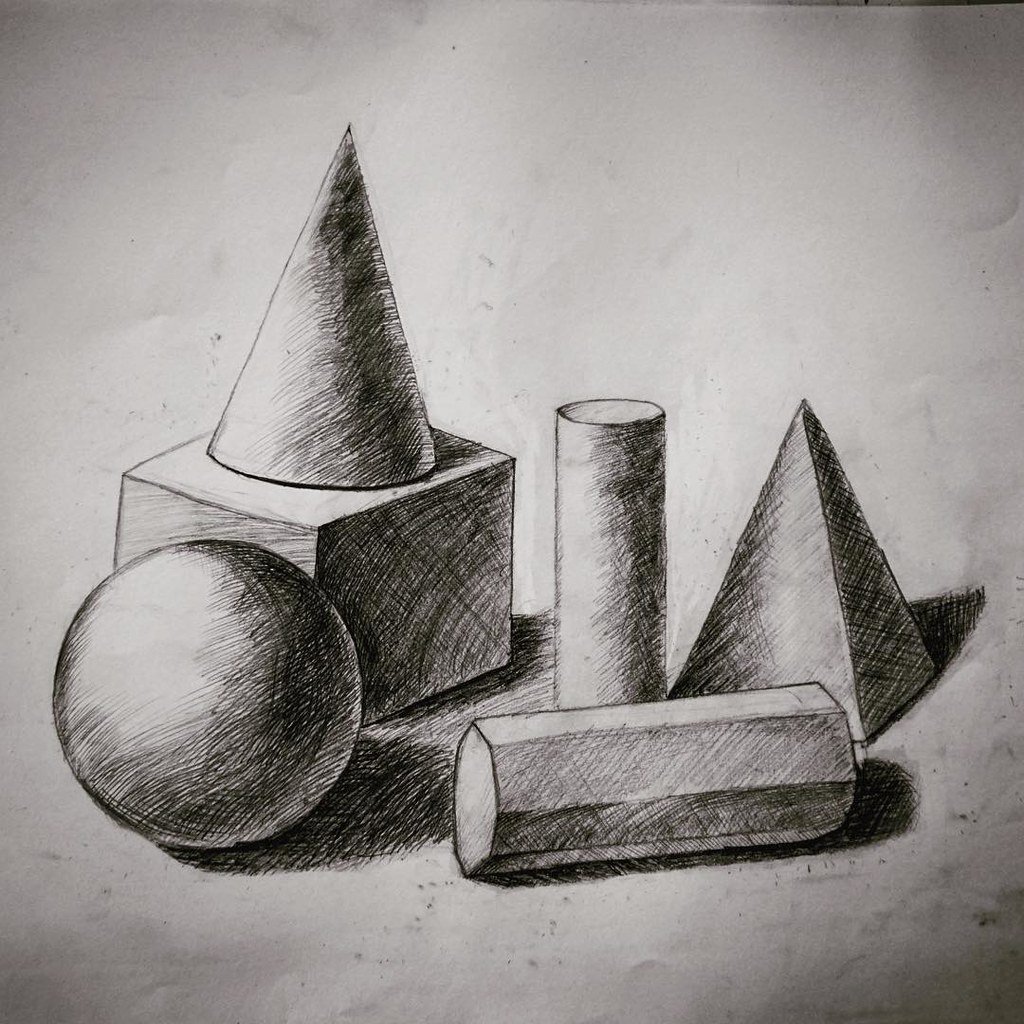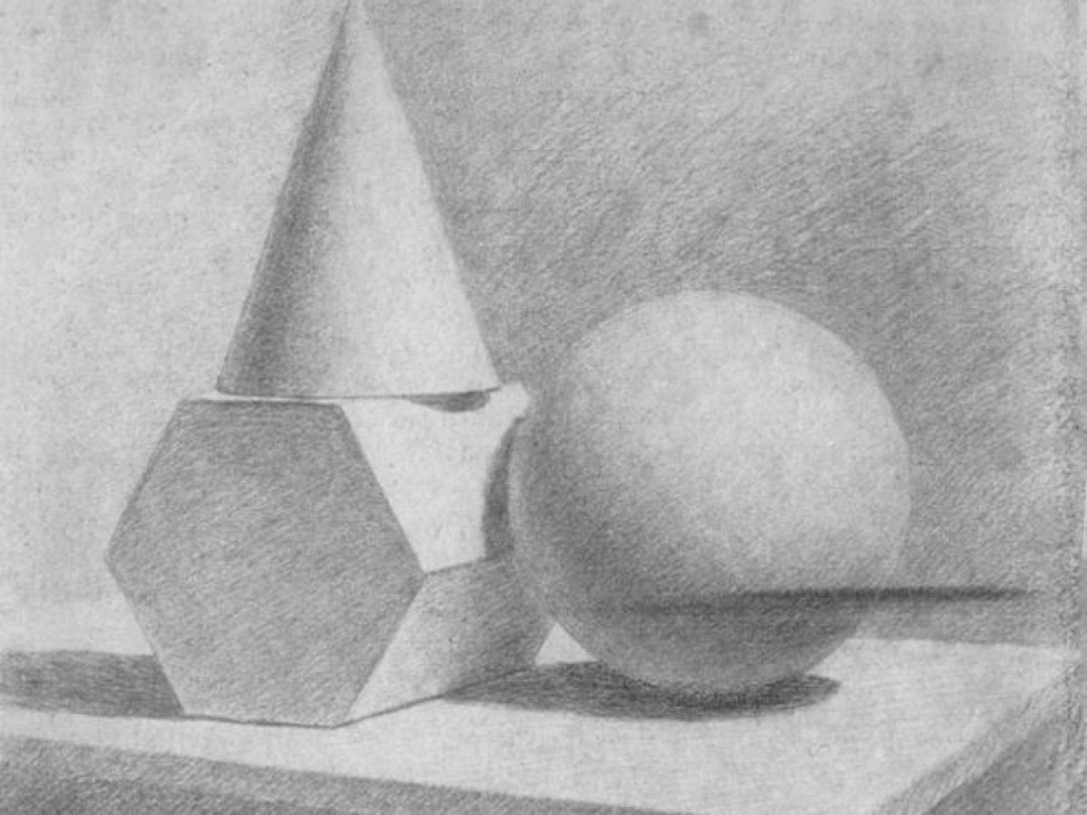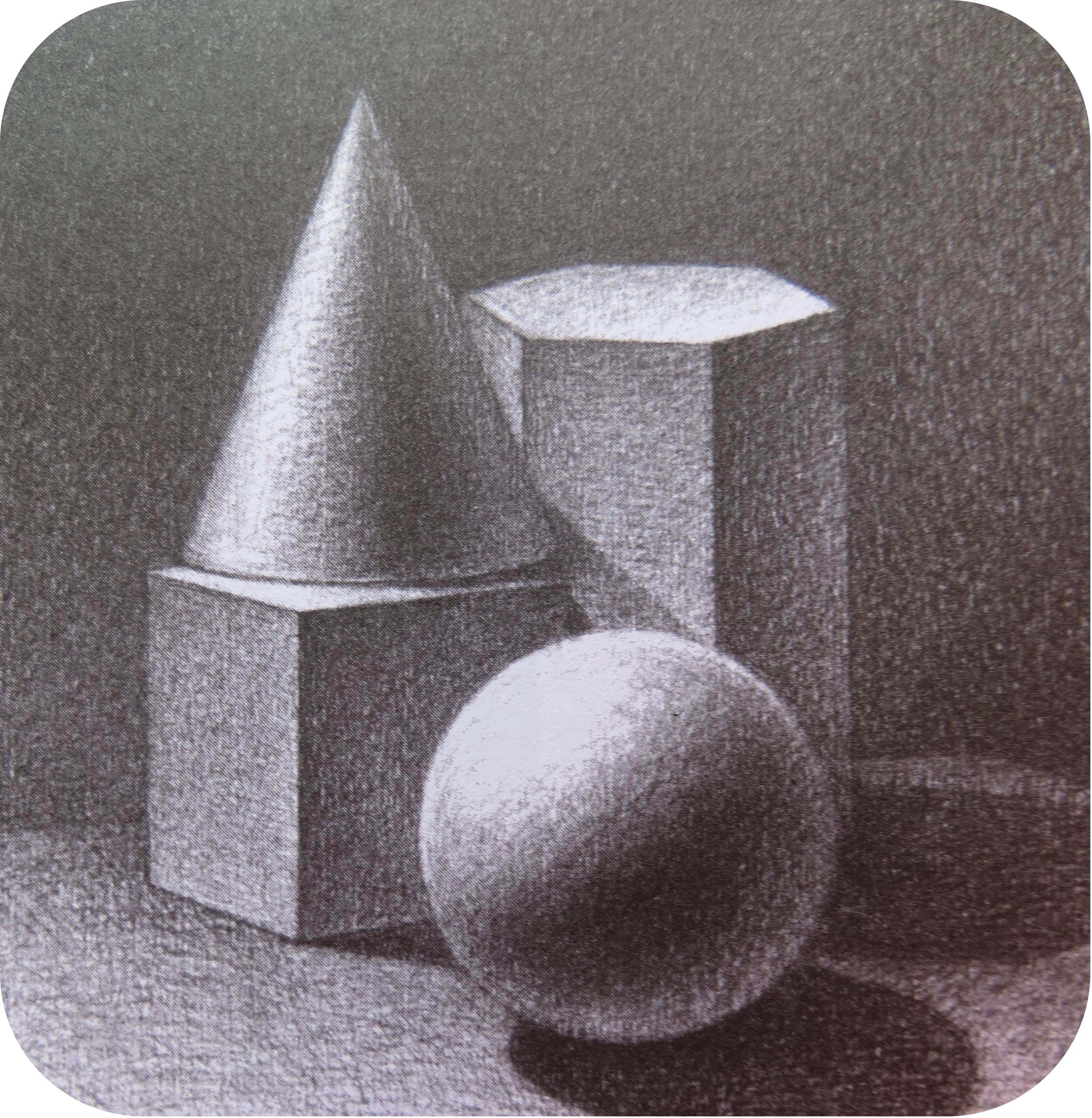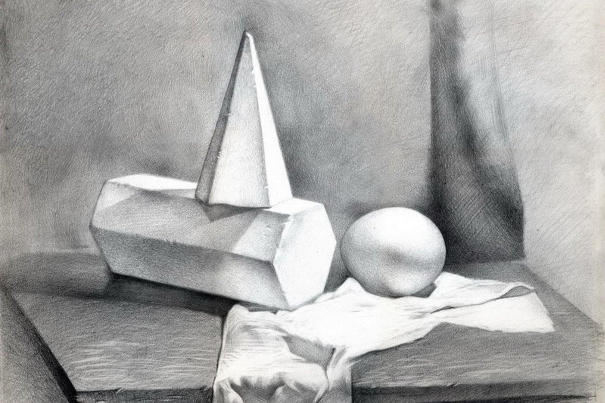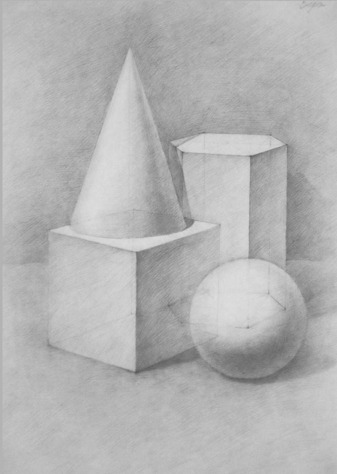 Натюрморт из геометрических форм (куб, конус, шар), Графика.