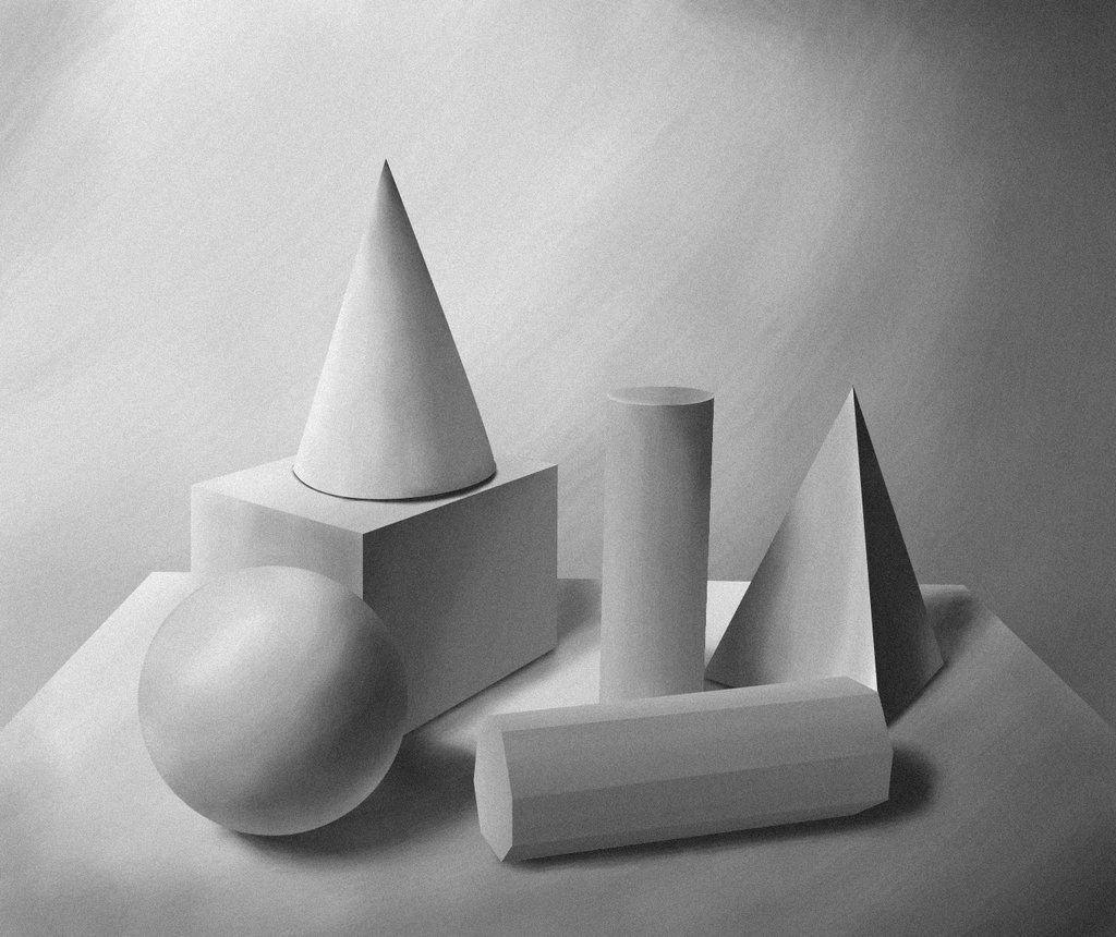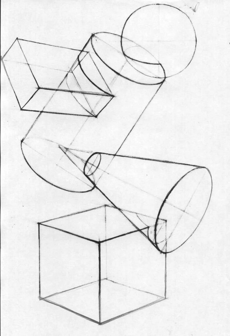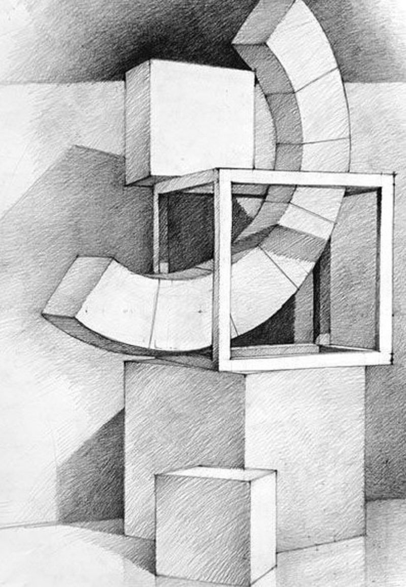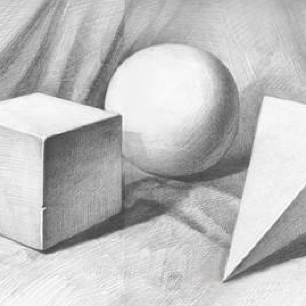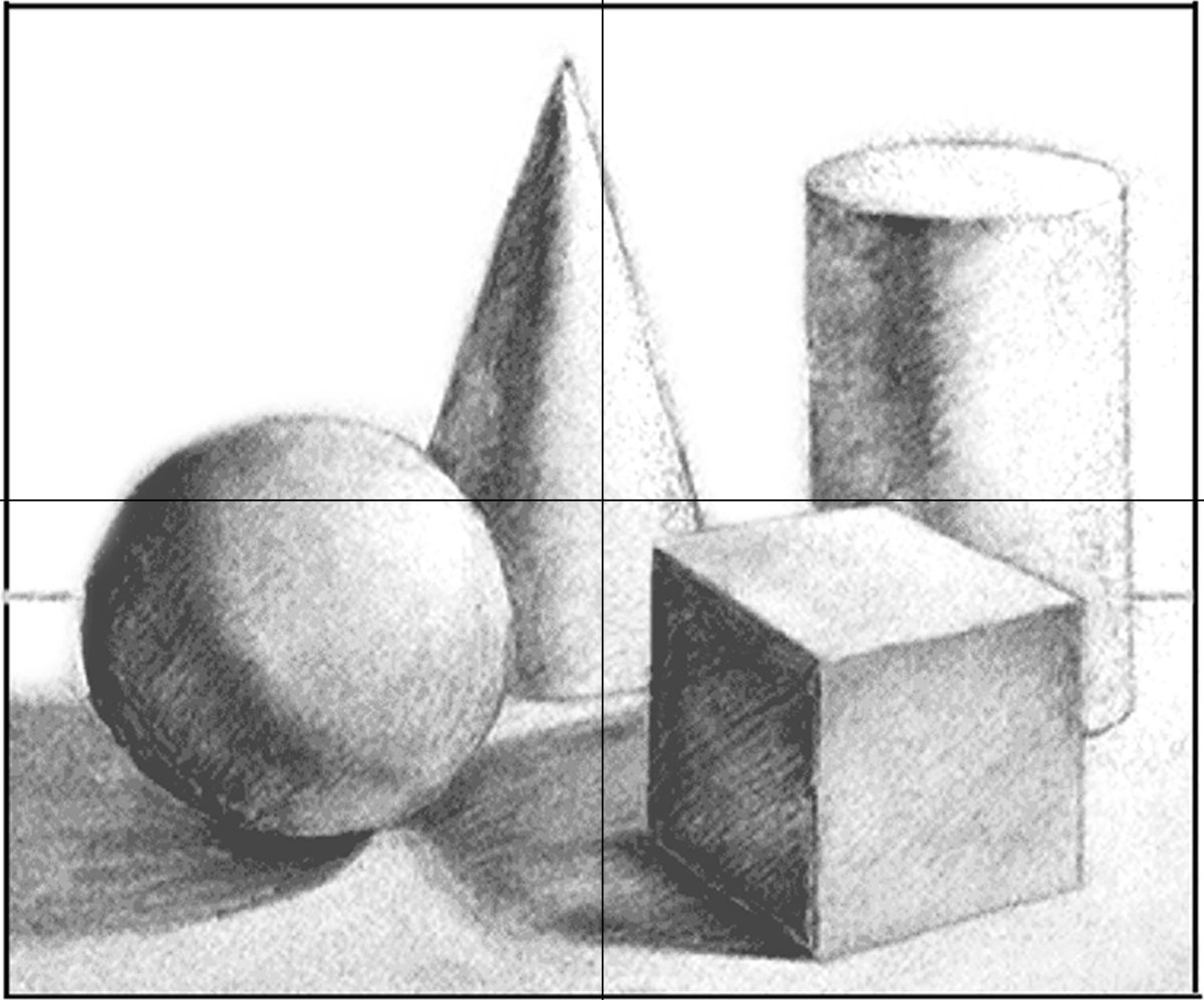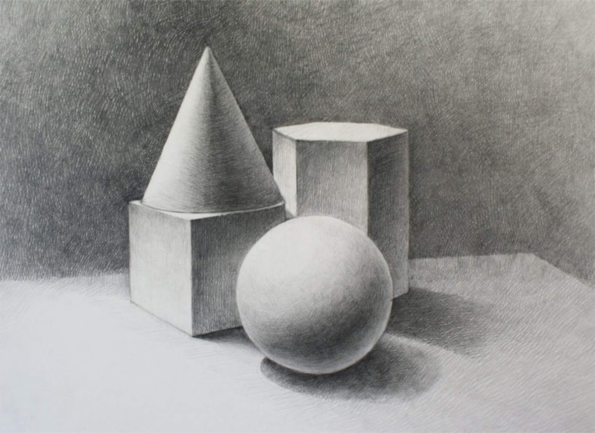 Натюрморт из геометрических форм (куб, конус, шар), Графика.