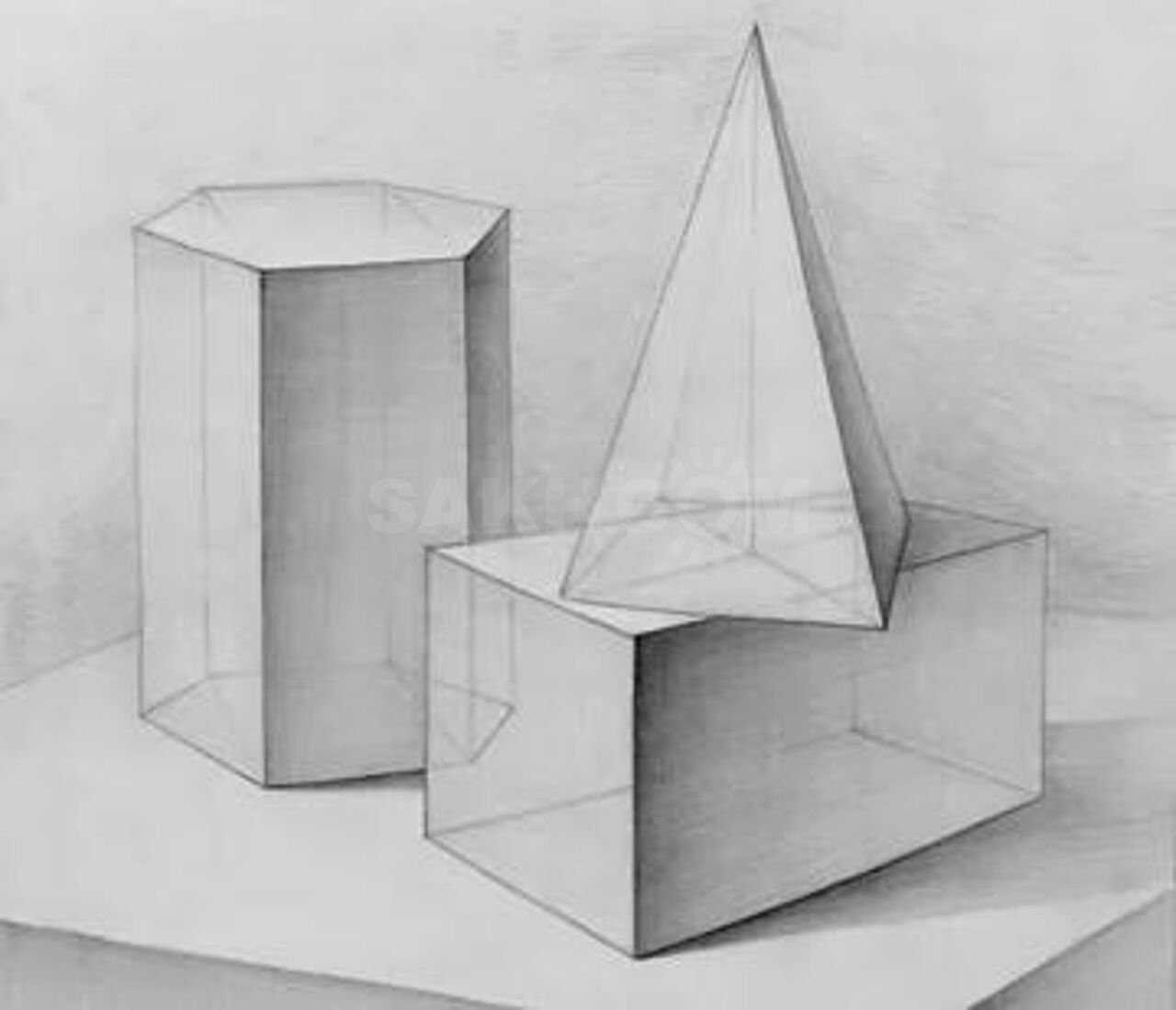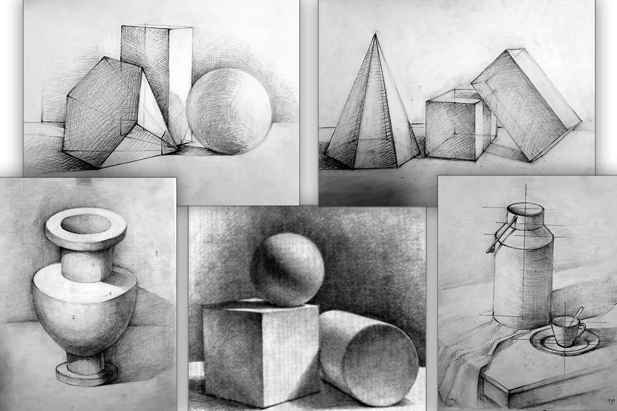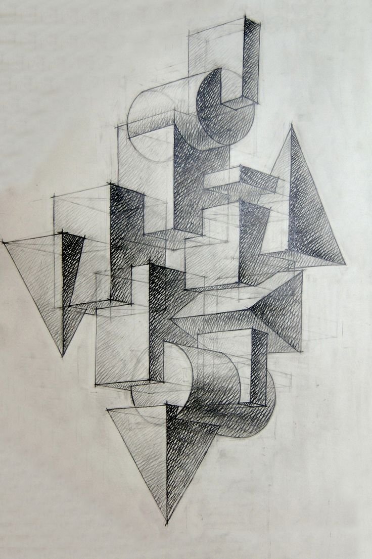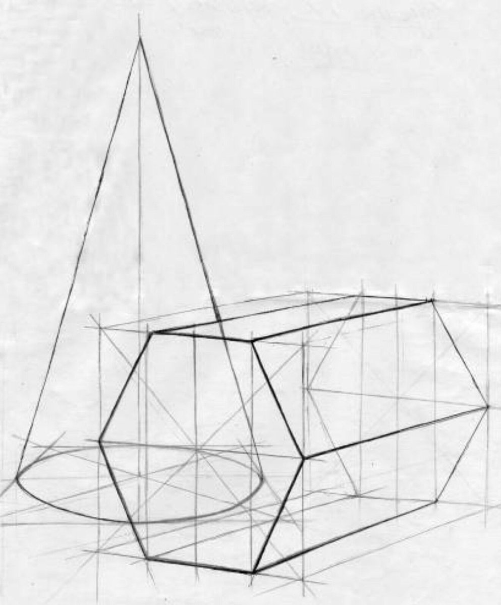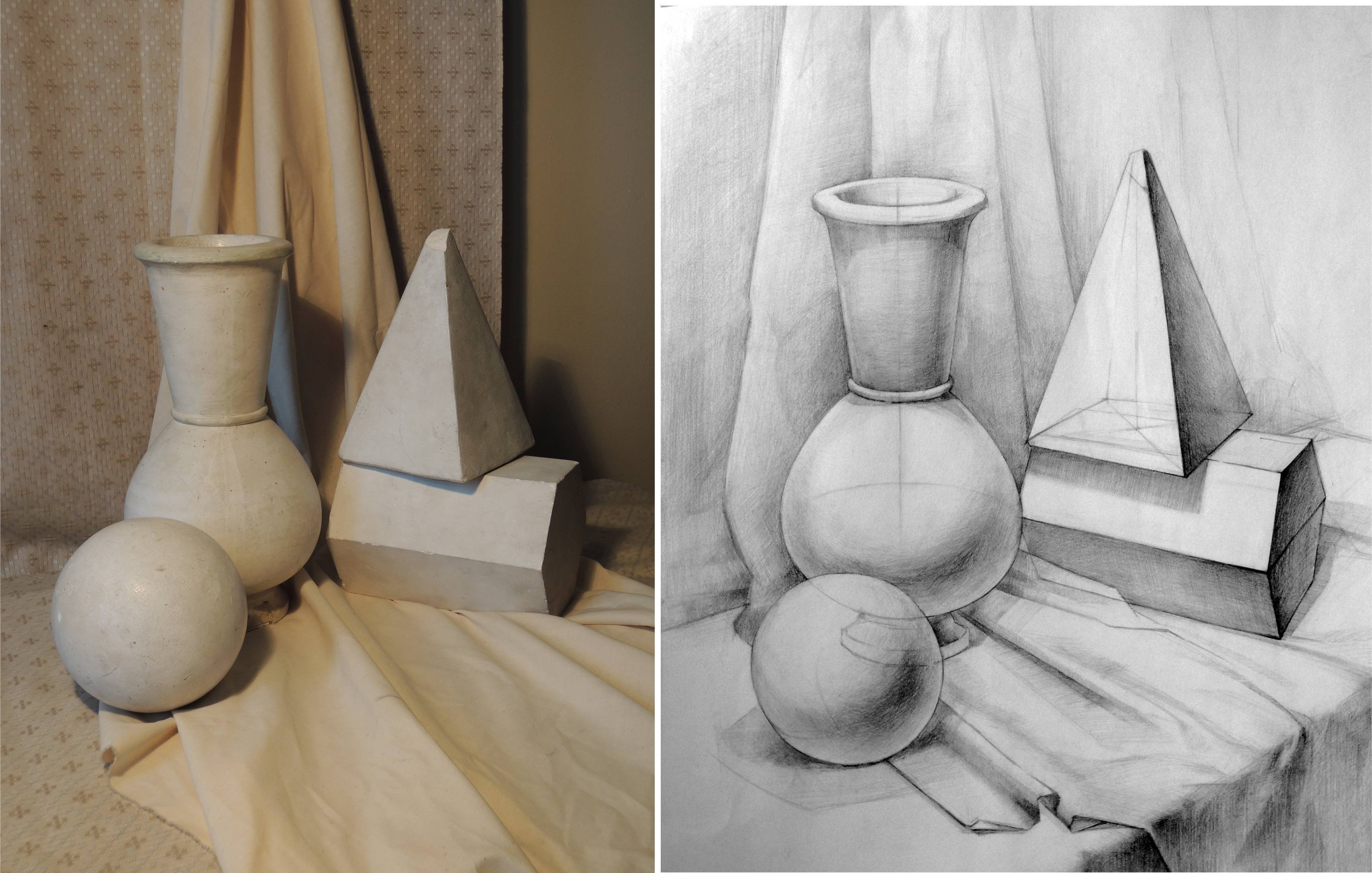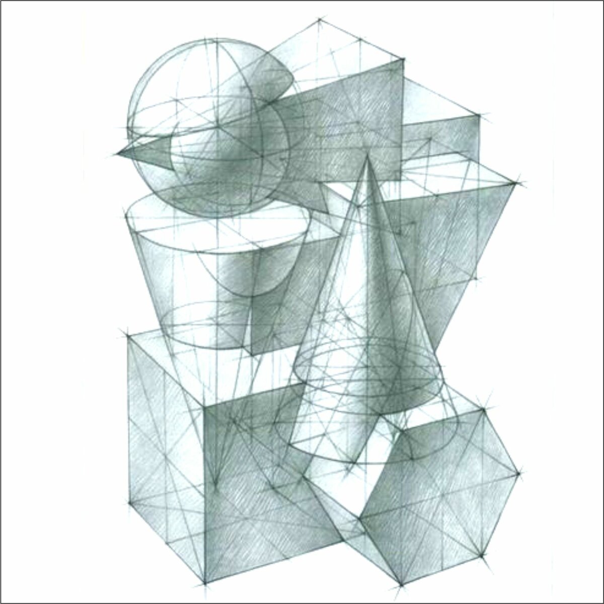 Натюрморт из геометрических форм (куб, конус, шар), Графика.