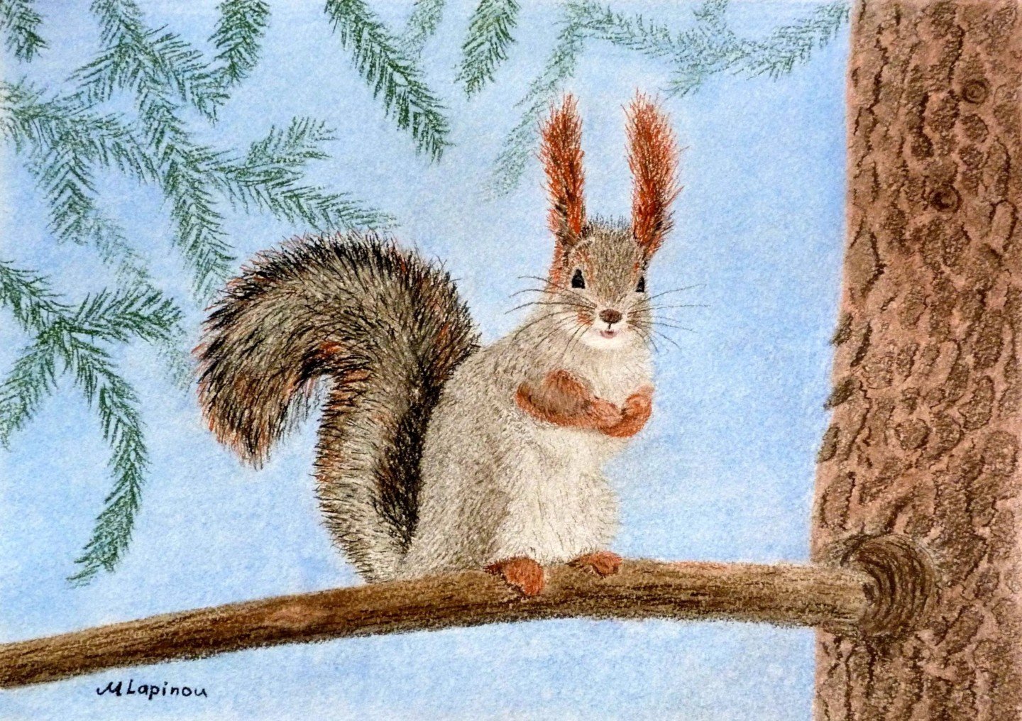Белка на ветке зимой рисунок