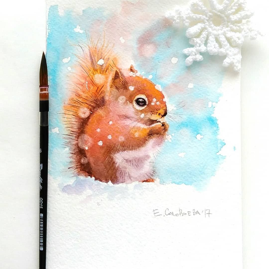 Белка зима акварель