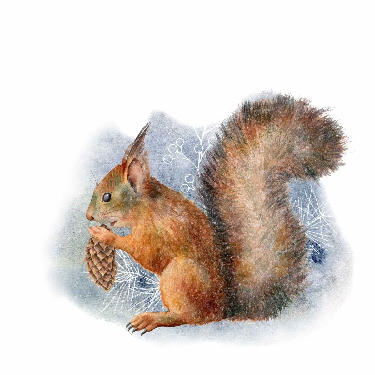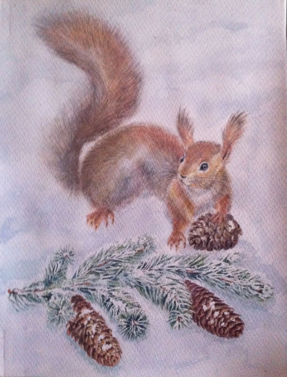Белка зимой акварель
