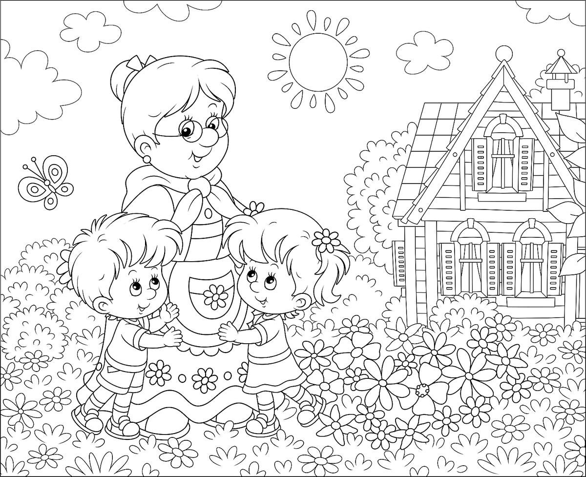 Раскраска бабушка и внуки