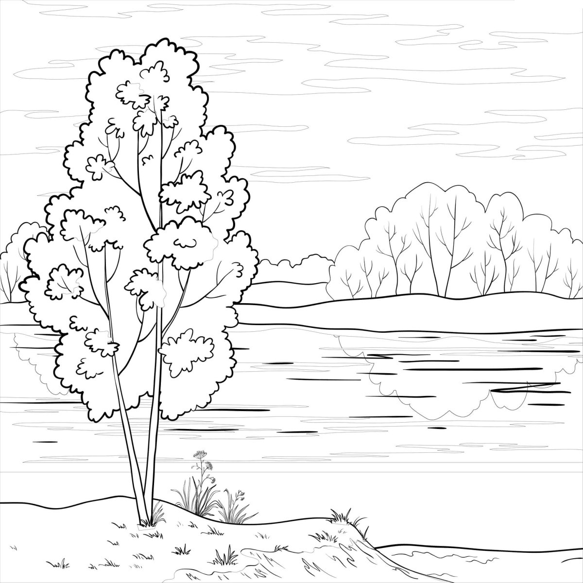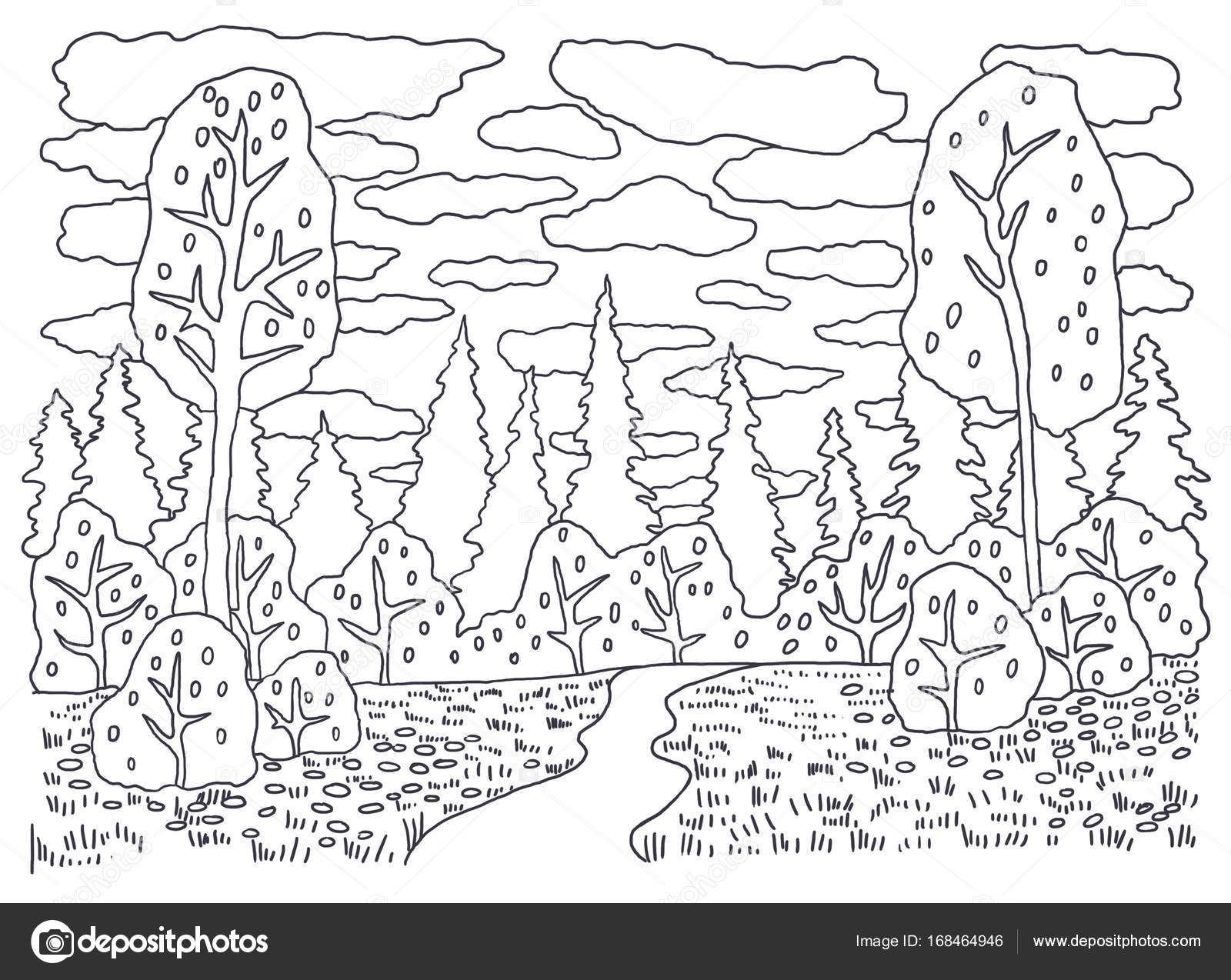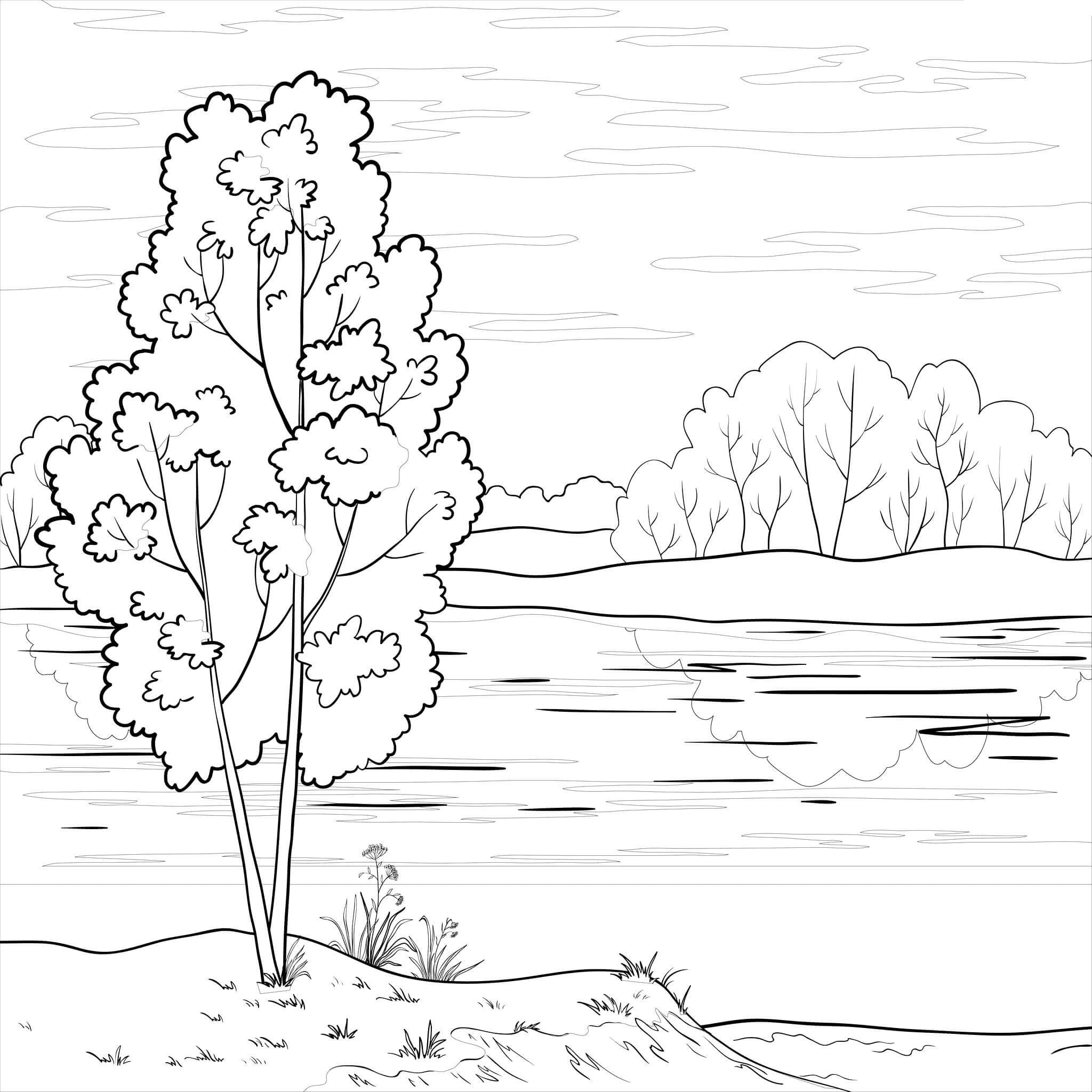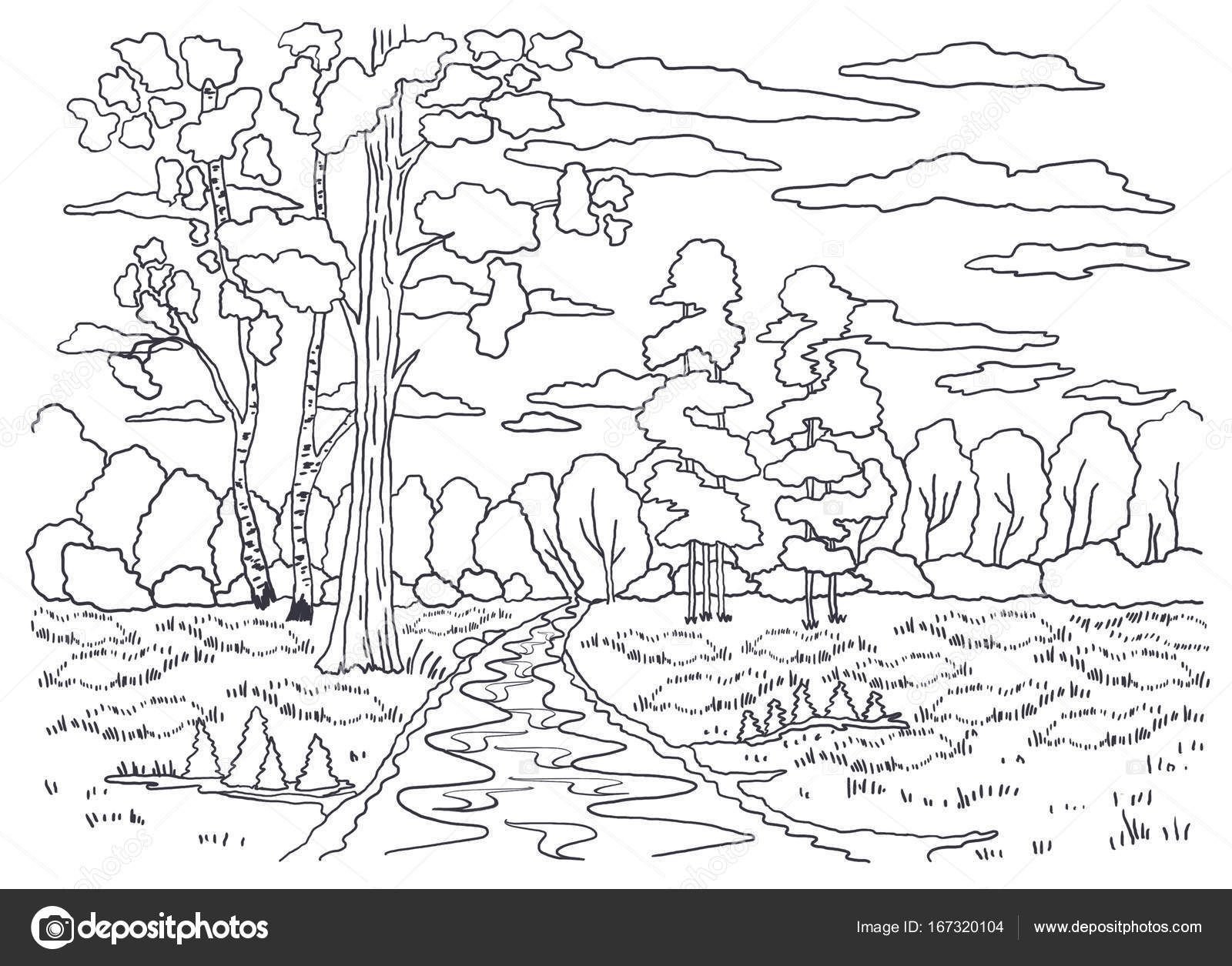Лес и речка раскраска