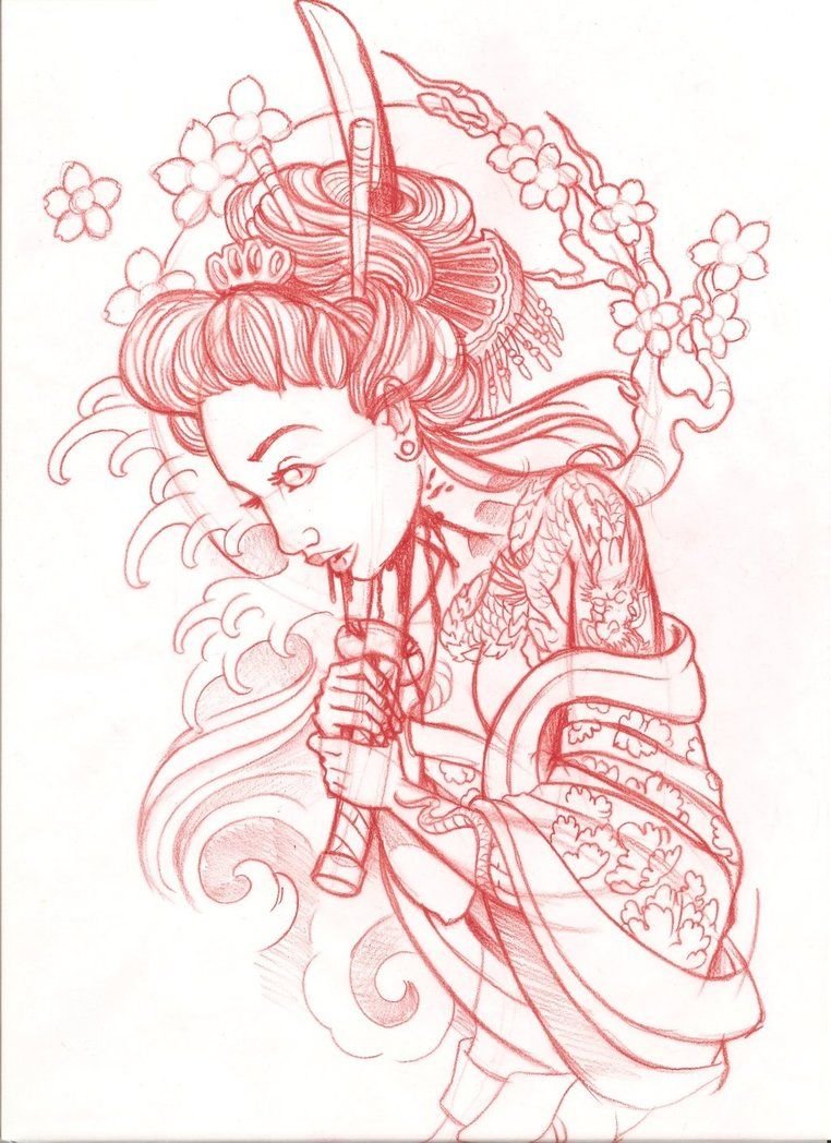 Эскиз тату японская гейша Самурай