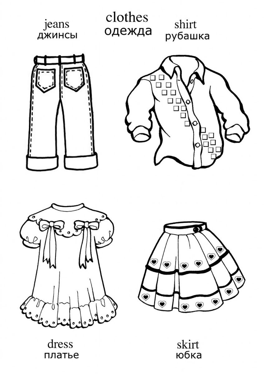 Раскраска одежда на английском для детей