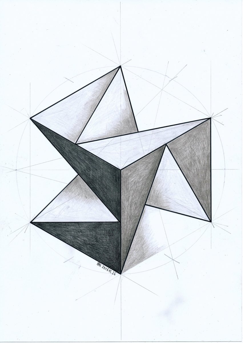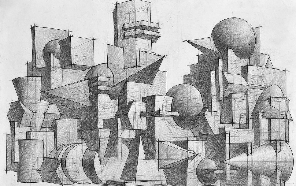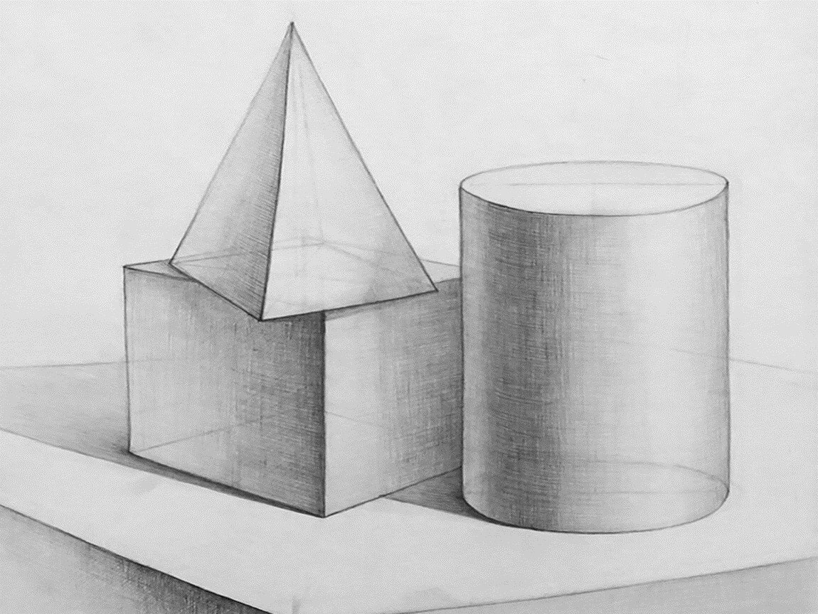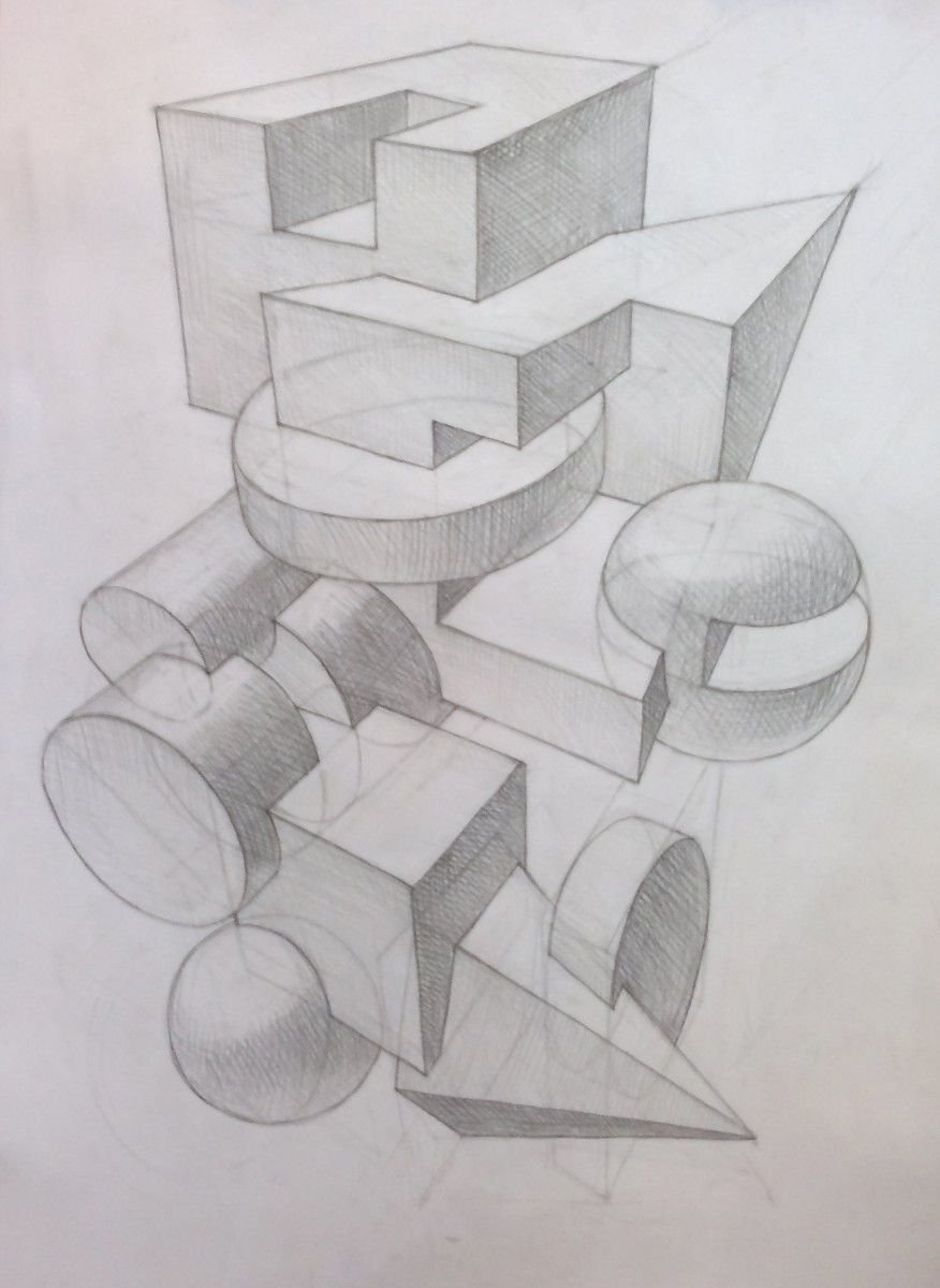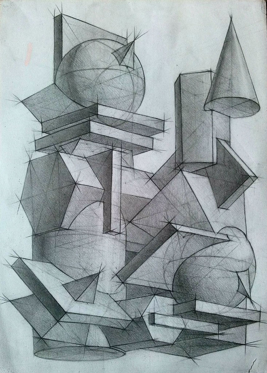 Натюрморт из геометрических форм (куб, конус, шар), Графика.