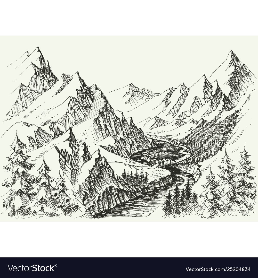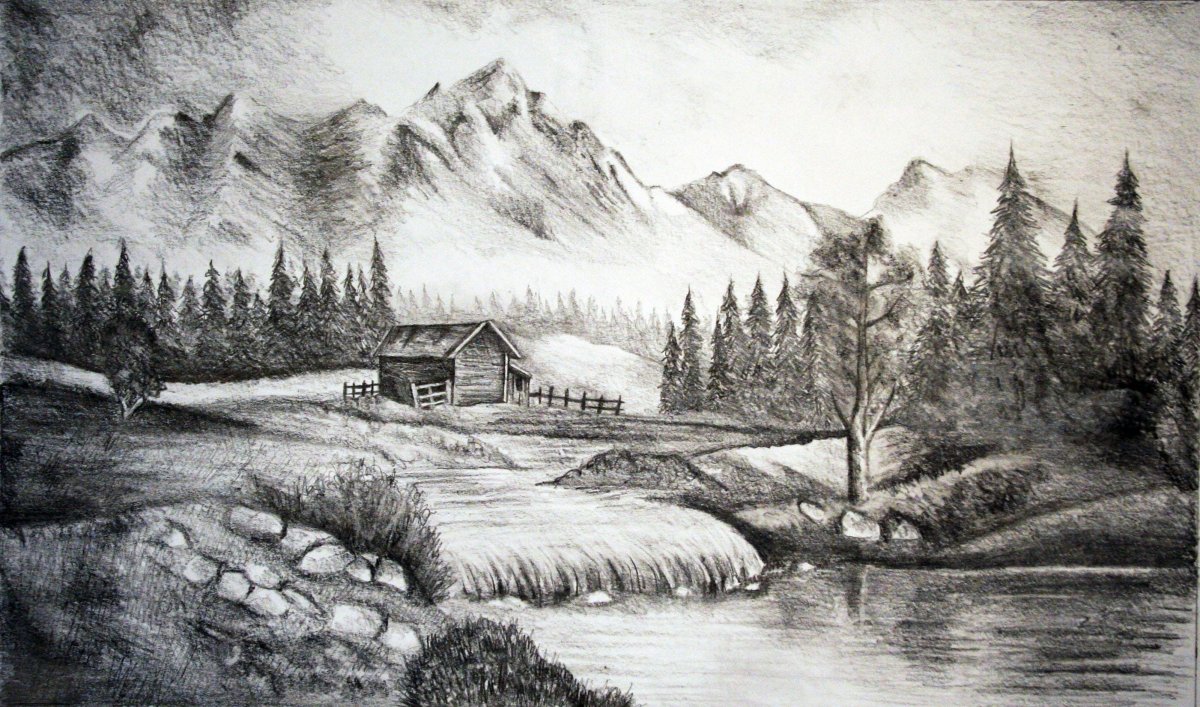 Речка с горами карандашом