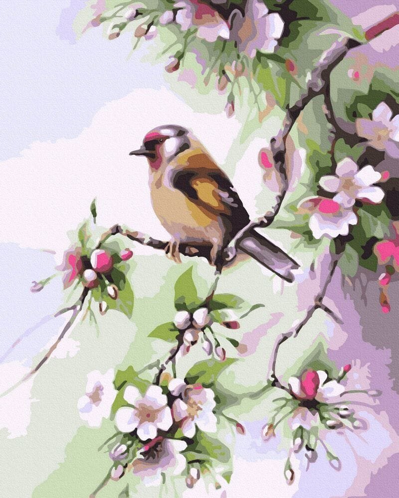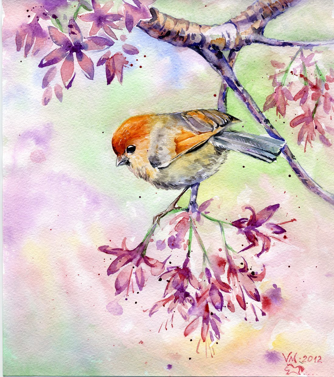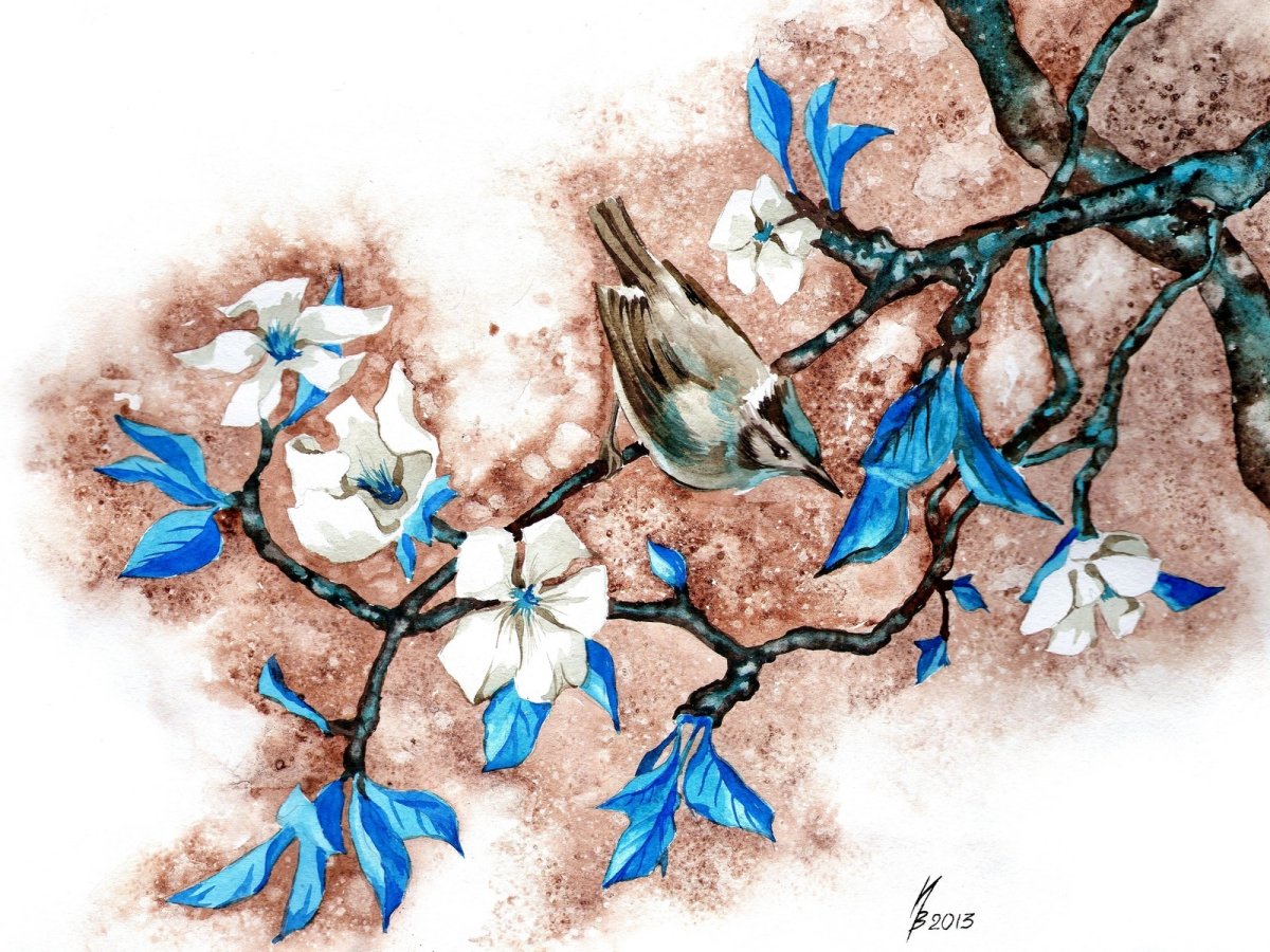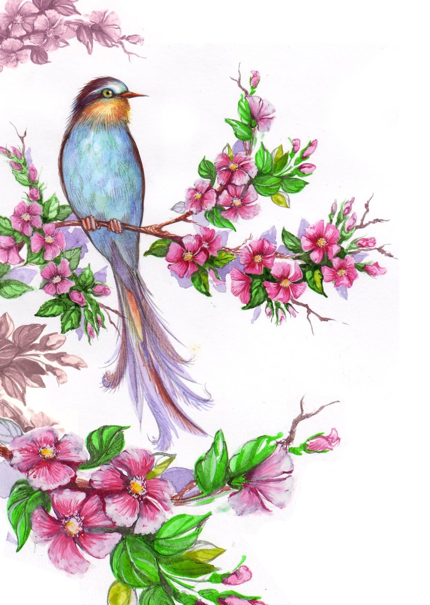 Птичка на цветущей ветке акварелью