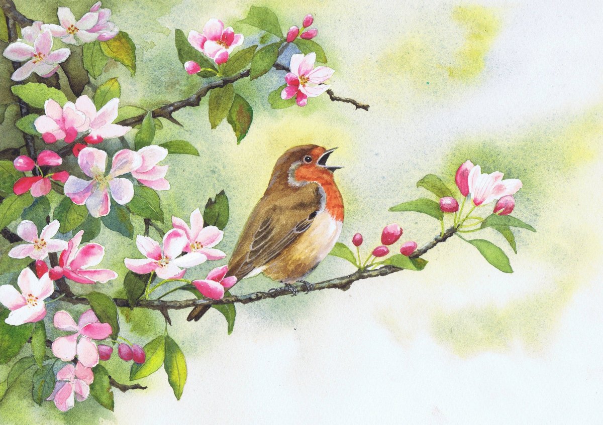 Акварель птичка на ветке Весна