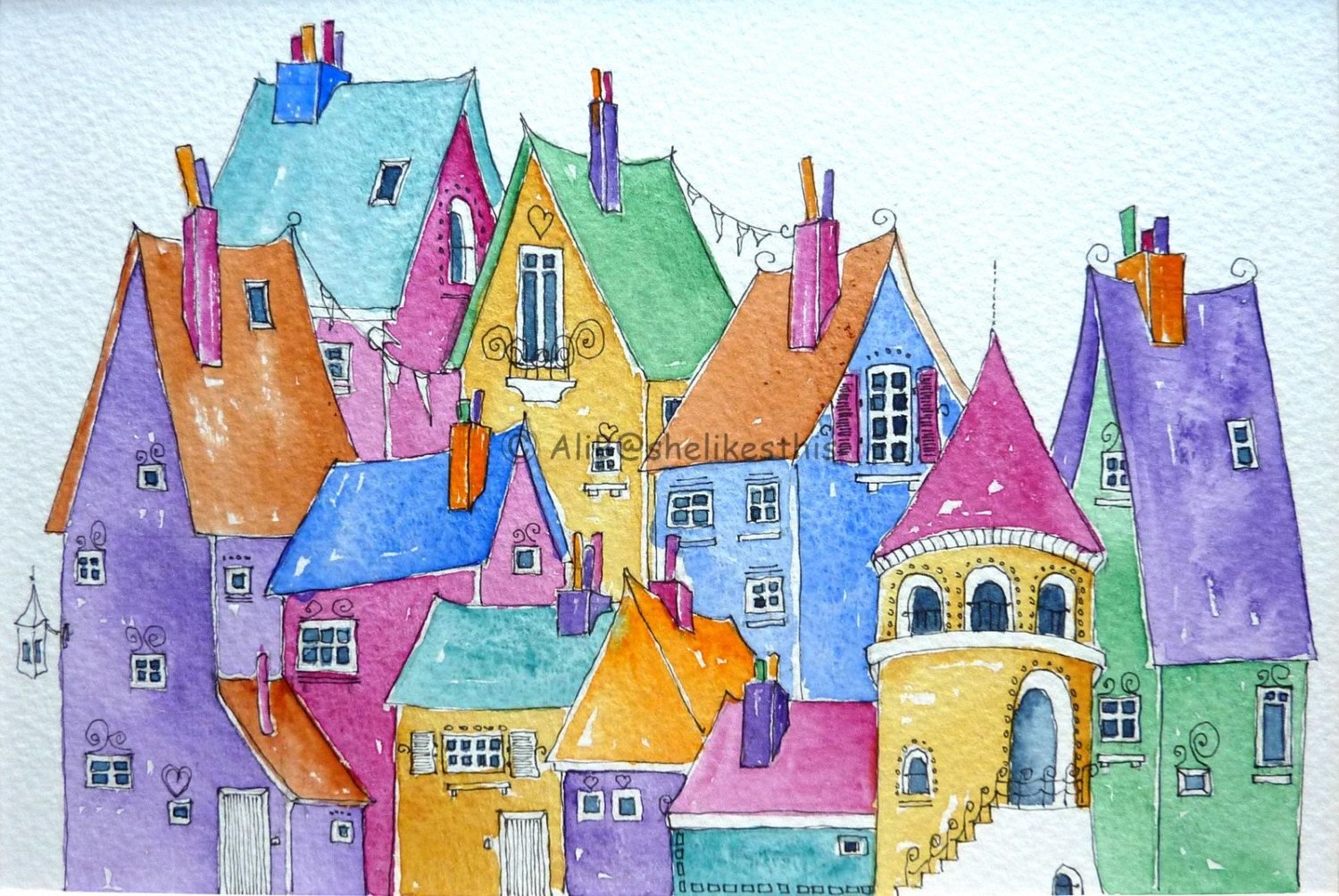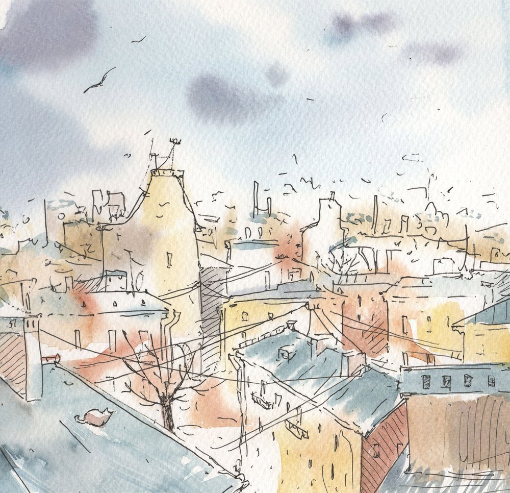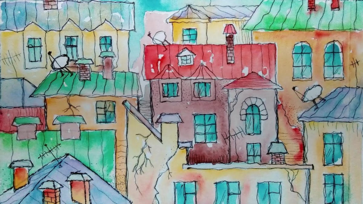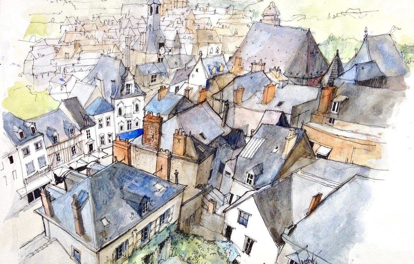 Крыши домов акварелью