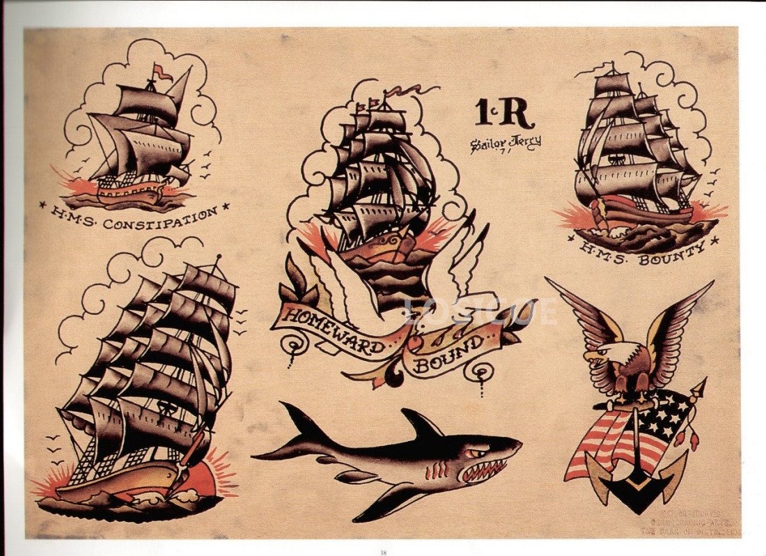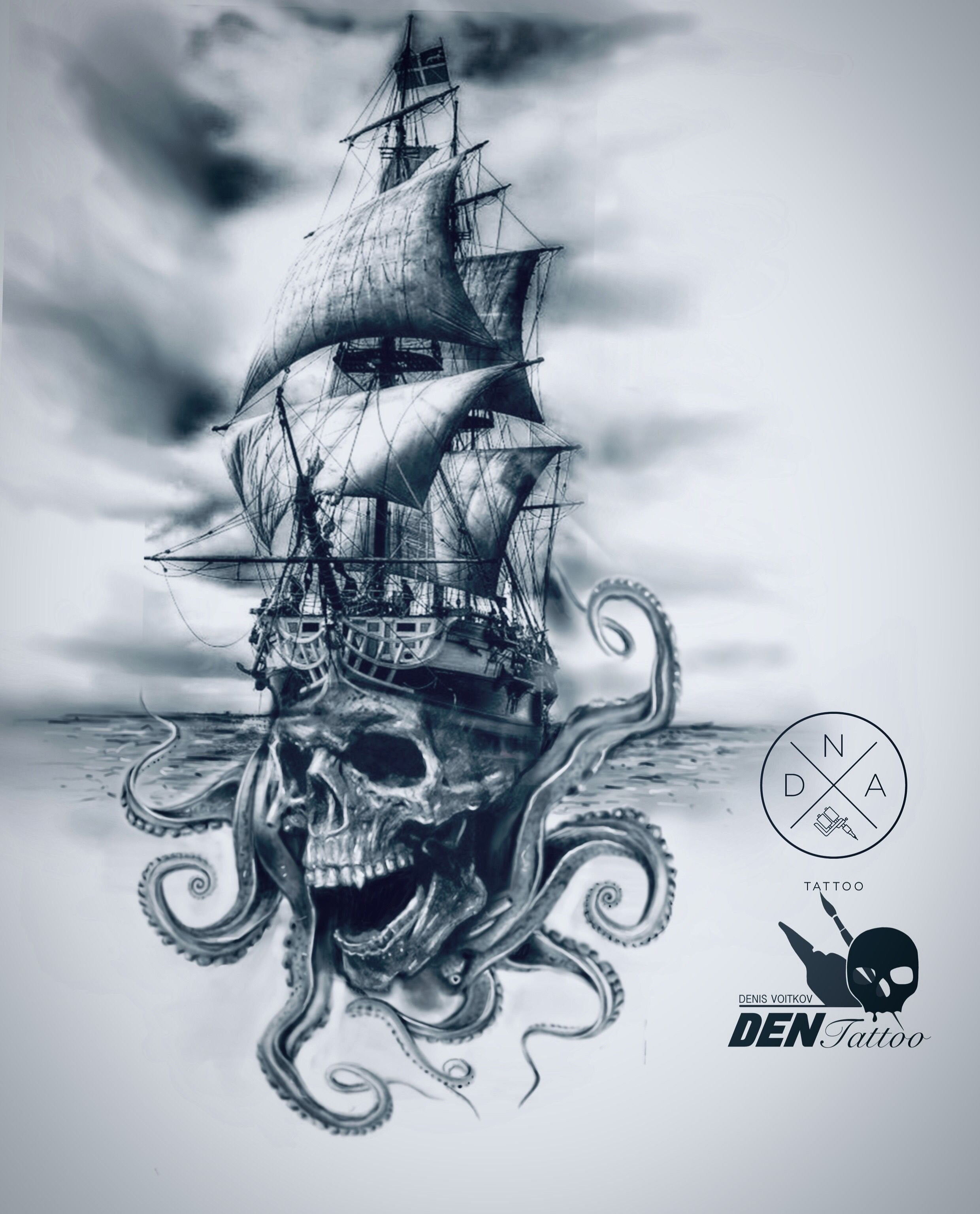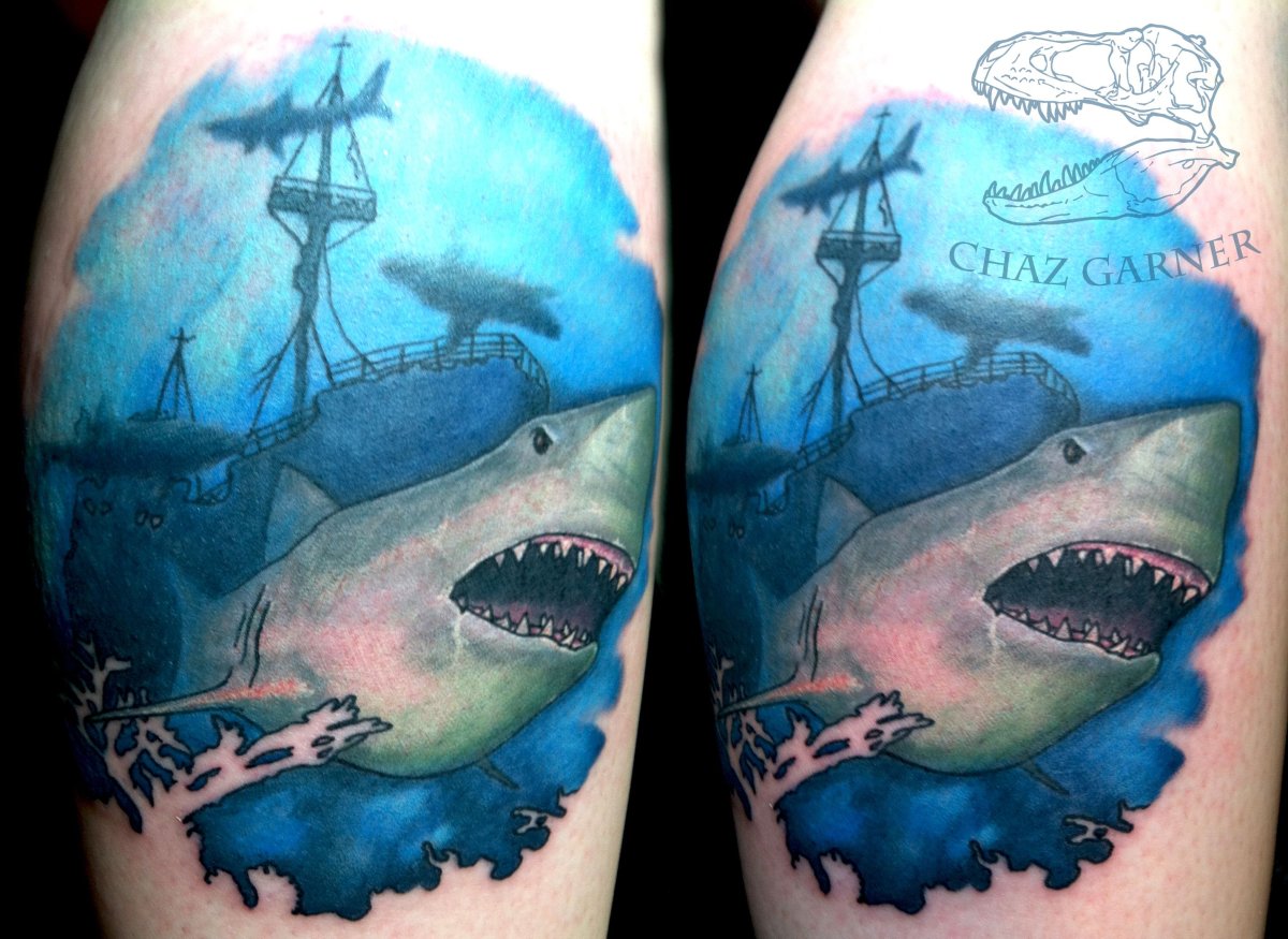Тату затонувший корабль и акула