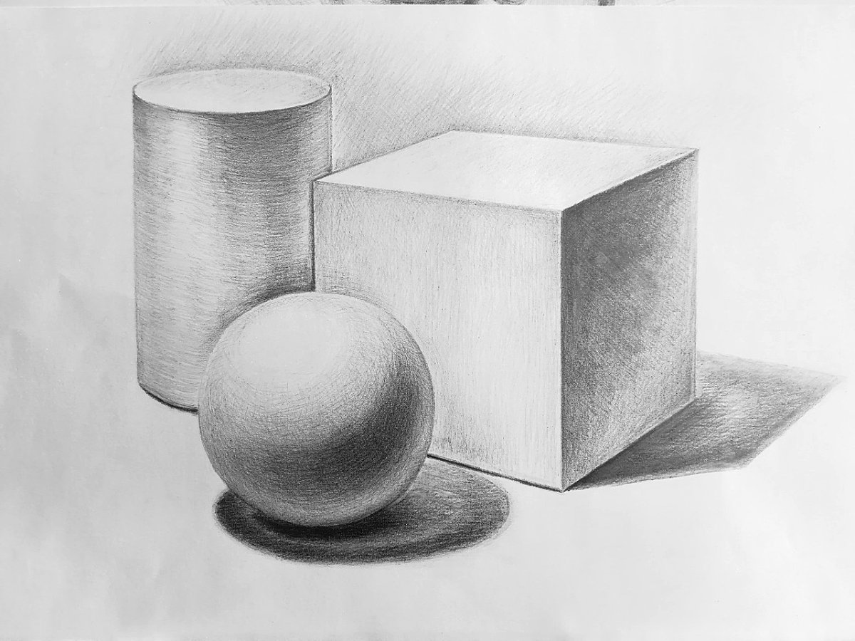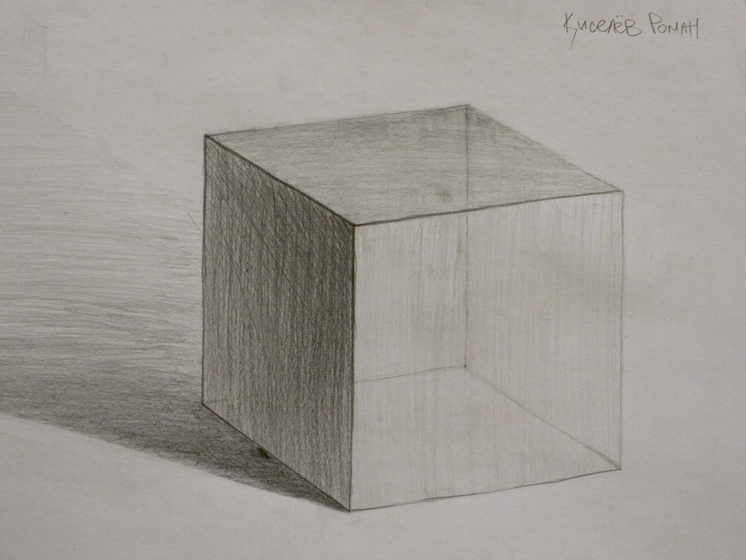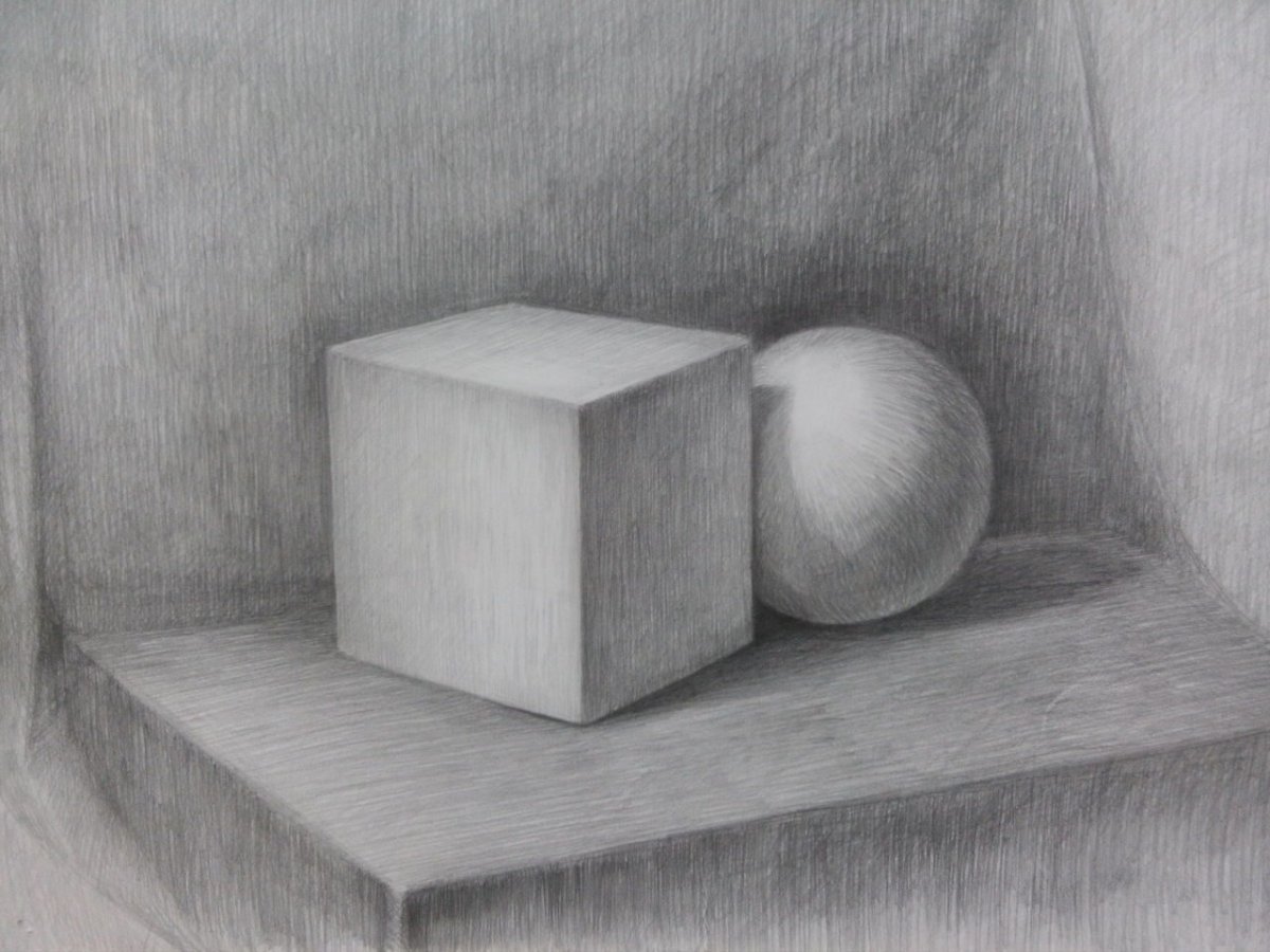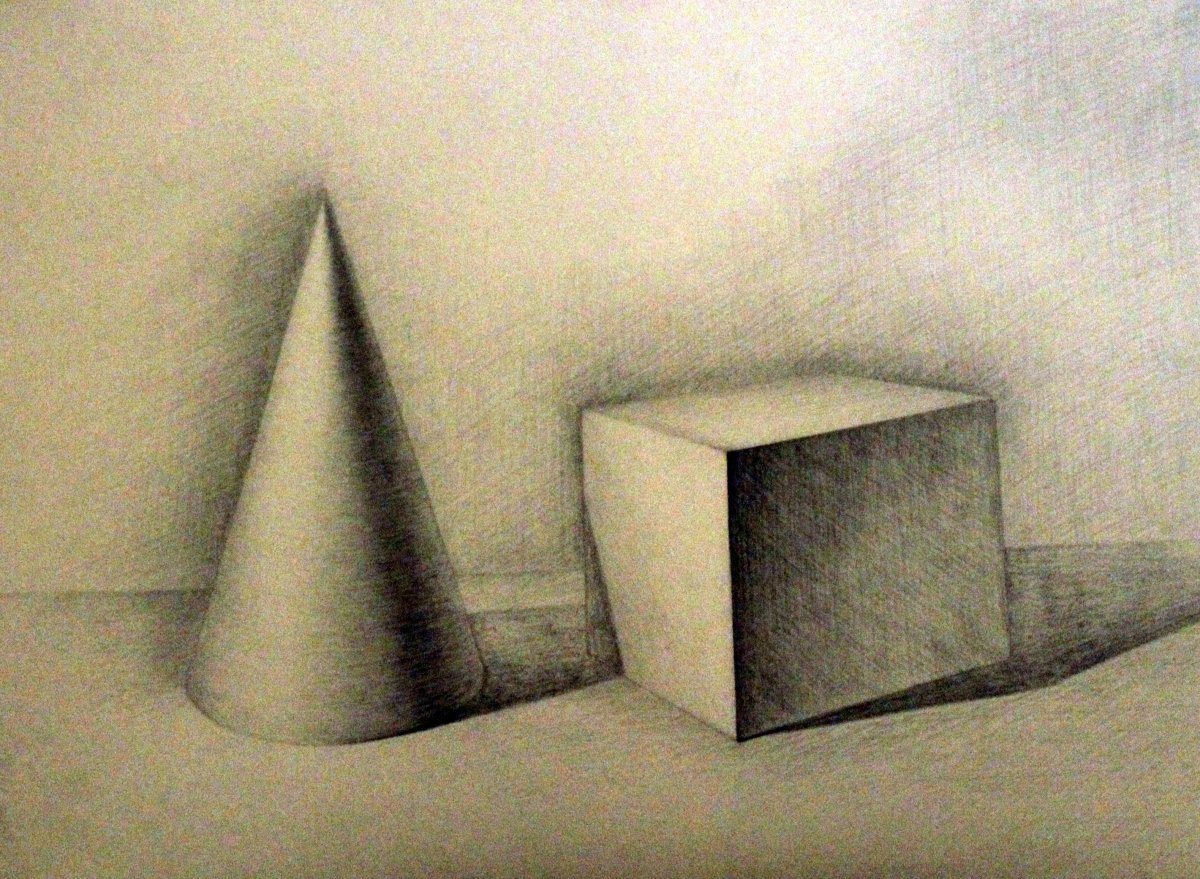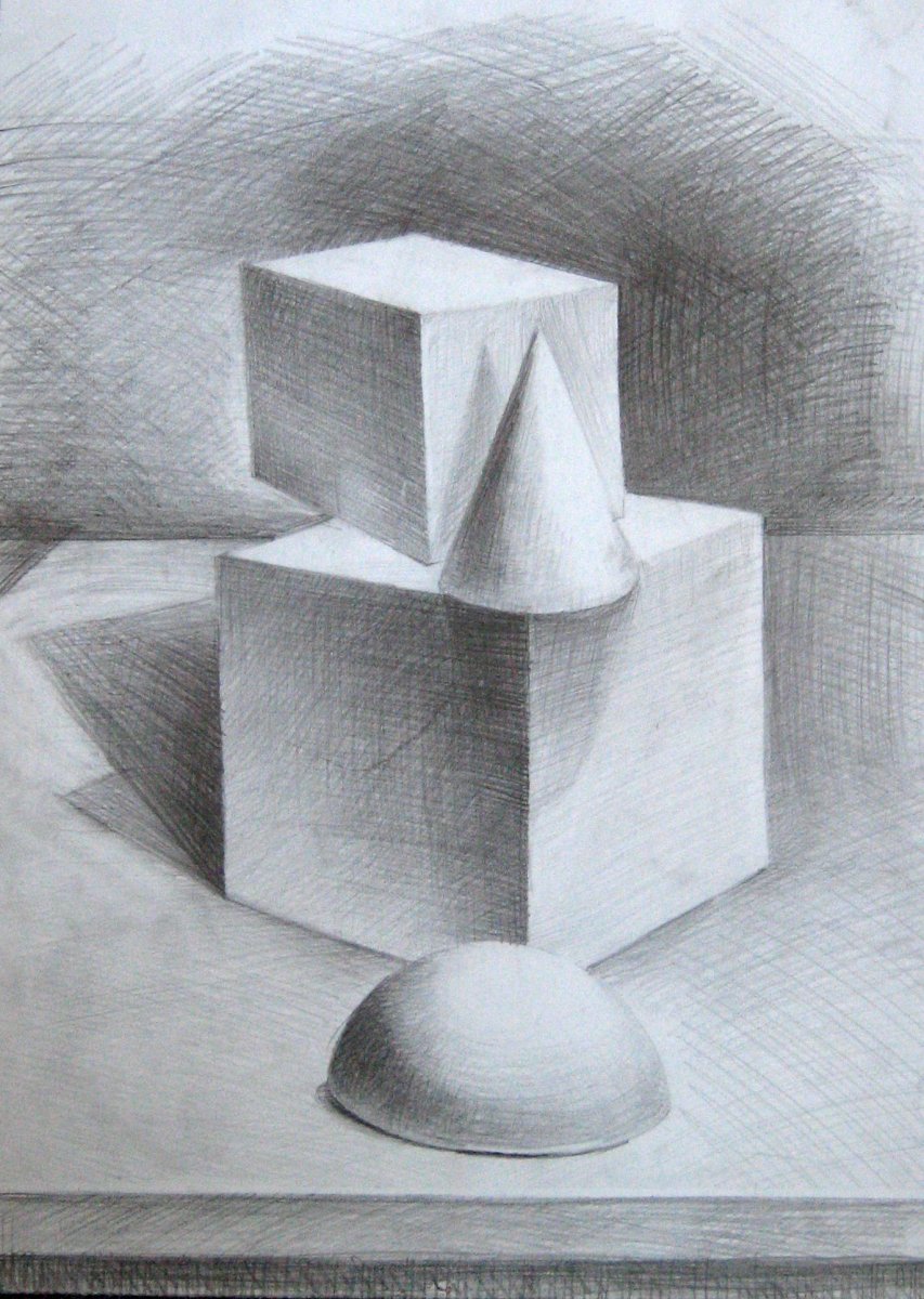 Натюрморт из геометрических форм (куб, конус, шар), Графика.