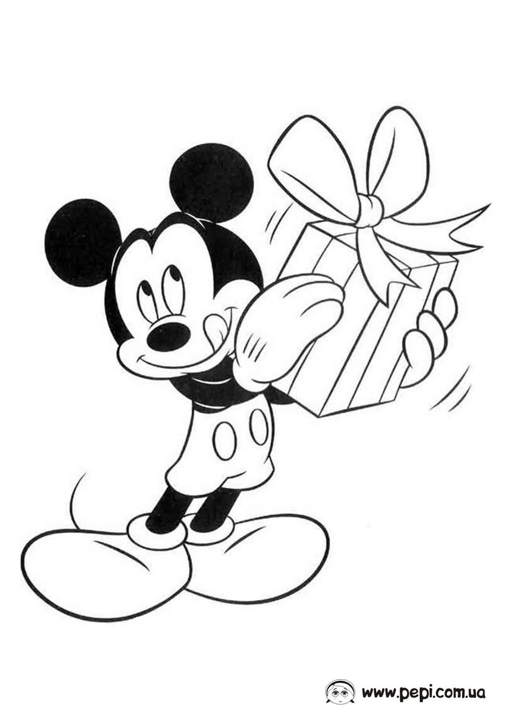 Микки с подарком раскраска