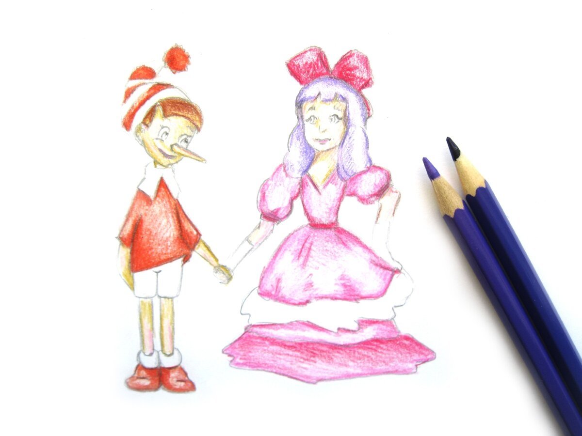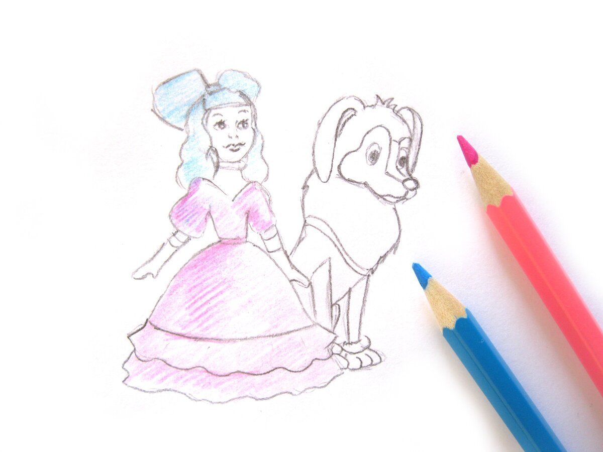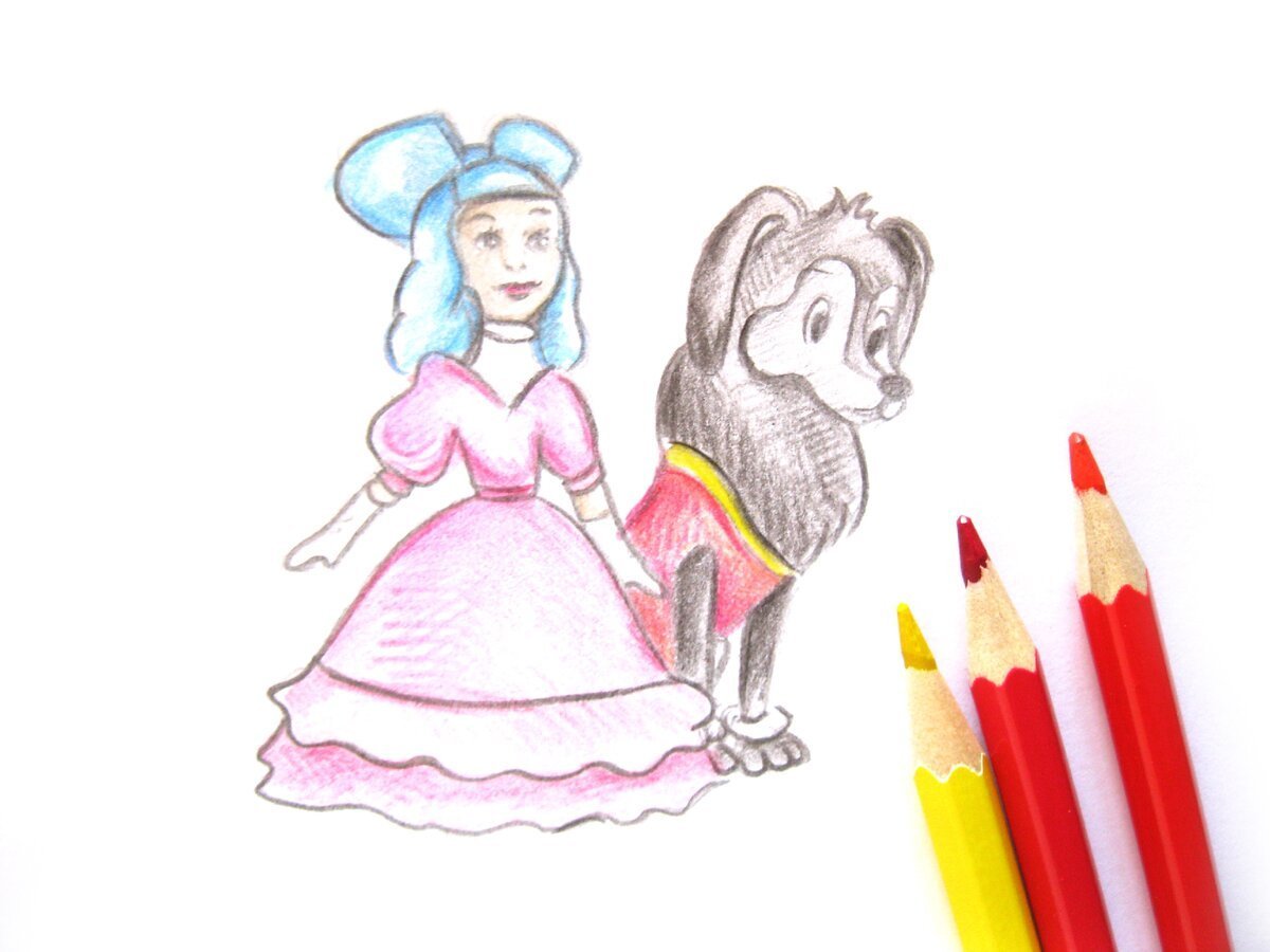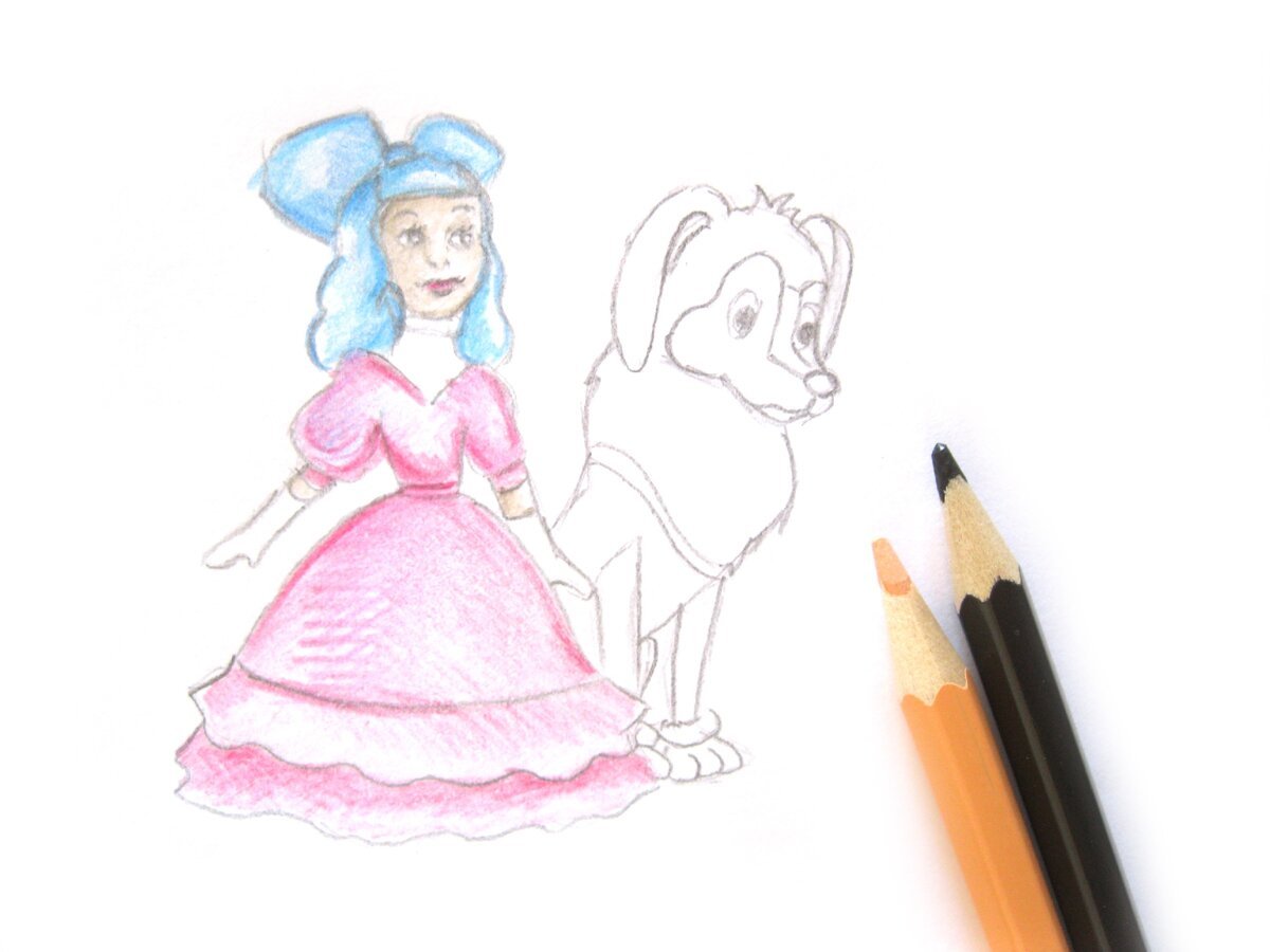 Мальвина и Артемон иллюстрация с цветными карандашами