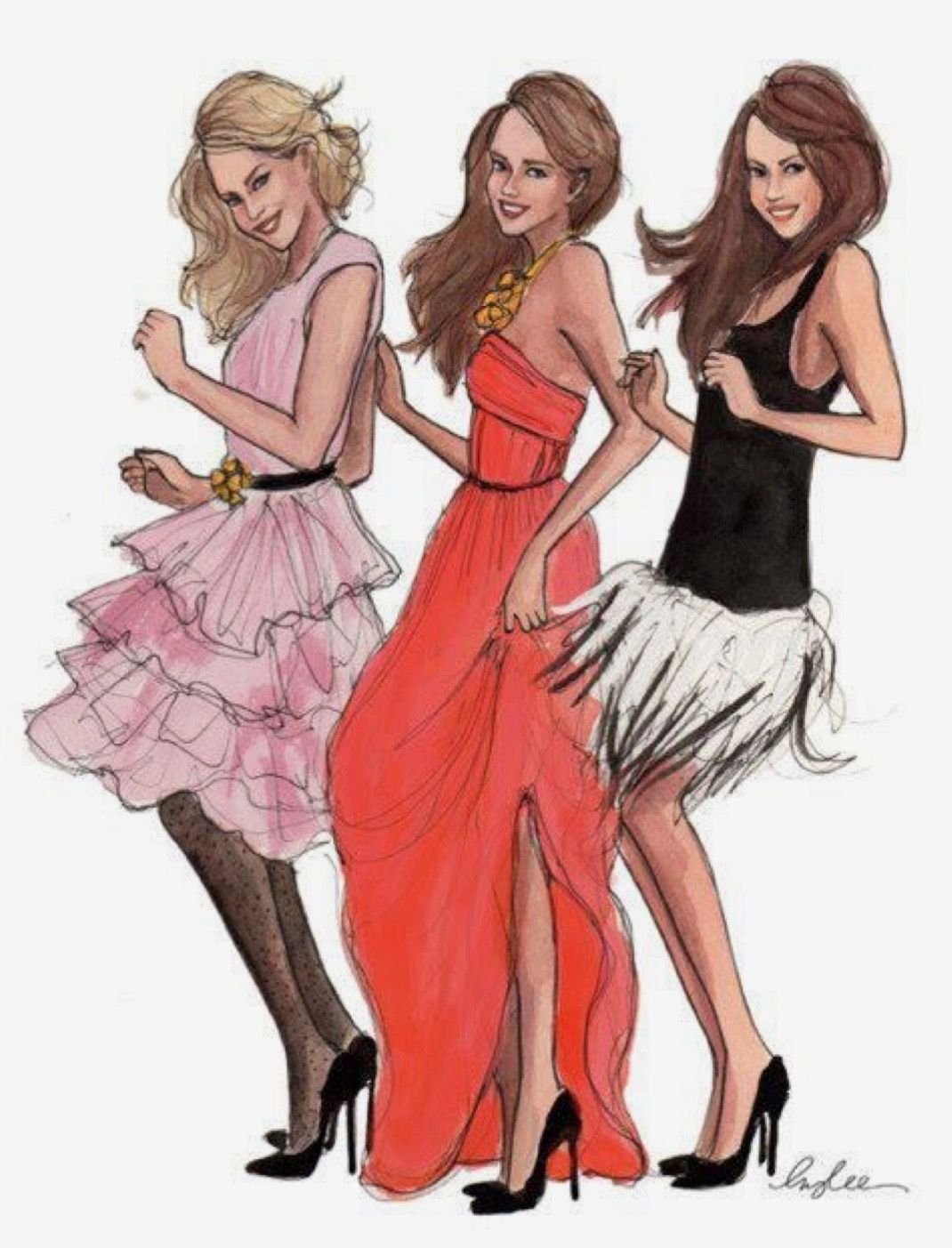 Три девушки в разных платьях рисунок