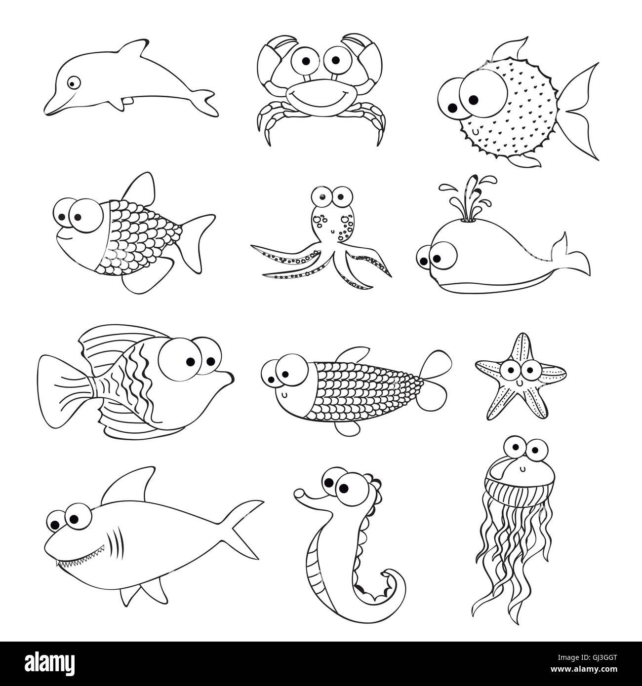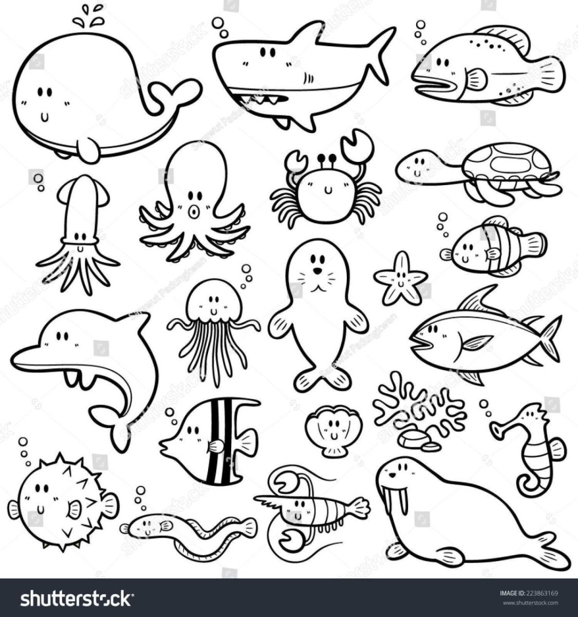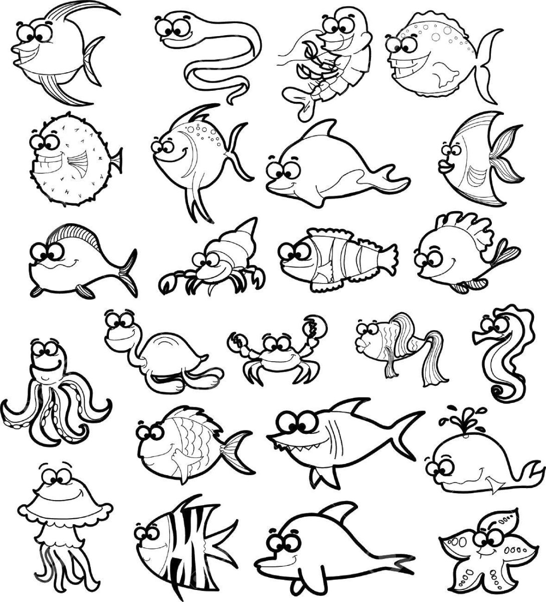 Морские обитатели для детей черно белые