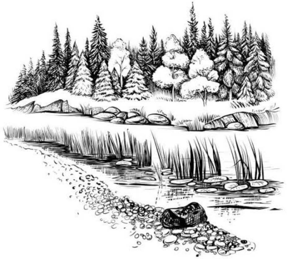 Лес с речкой карандашом