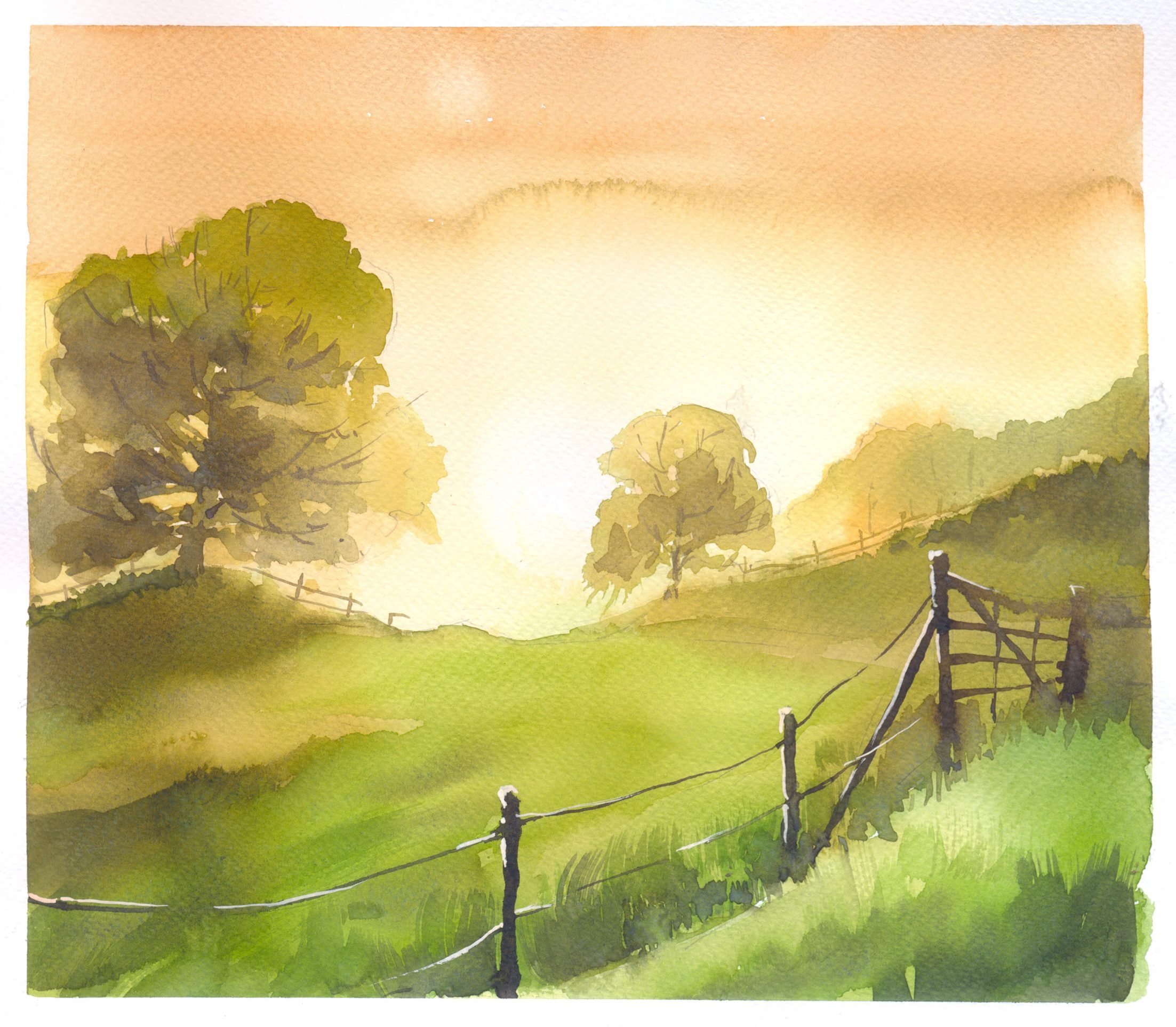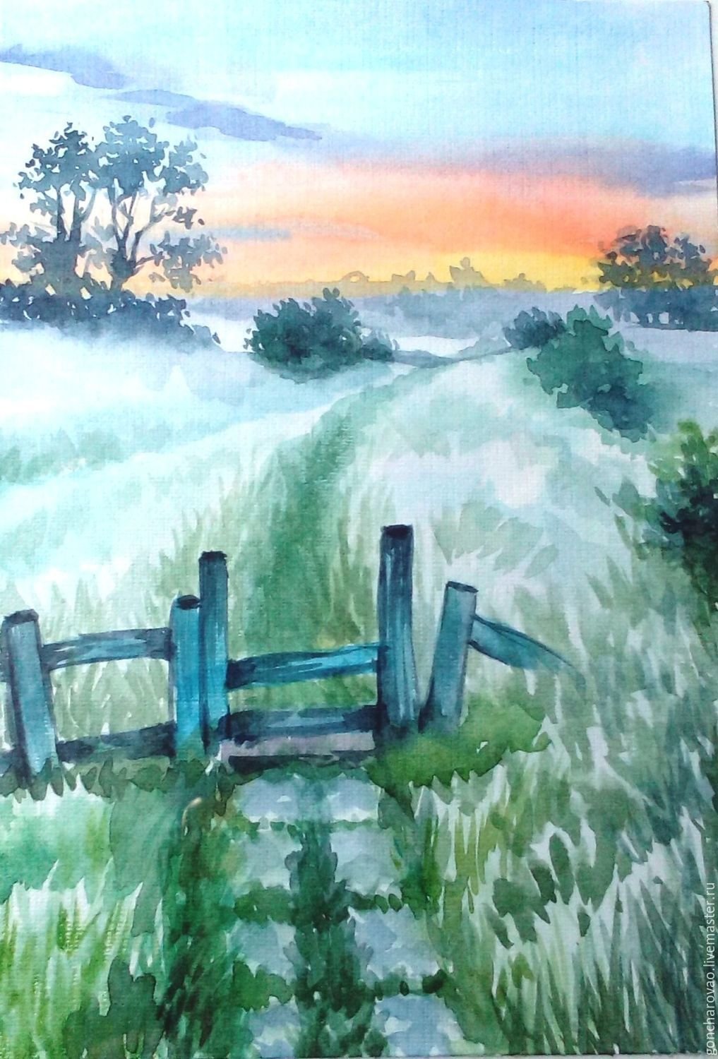 Утренний пейзаж акварелью