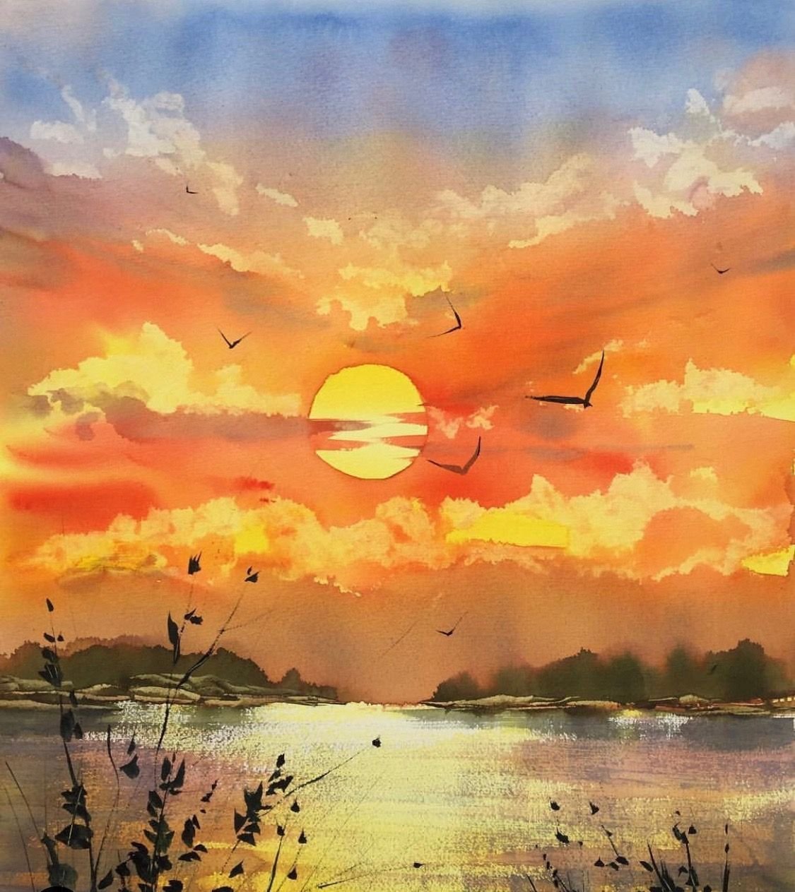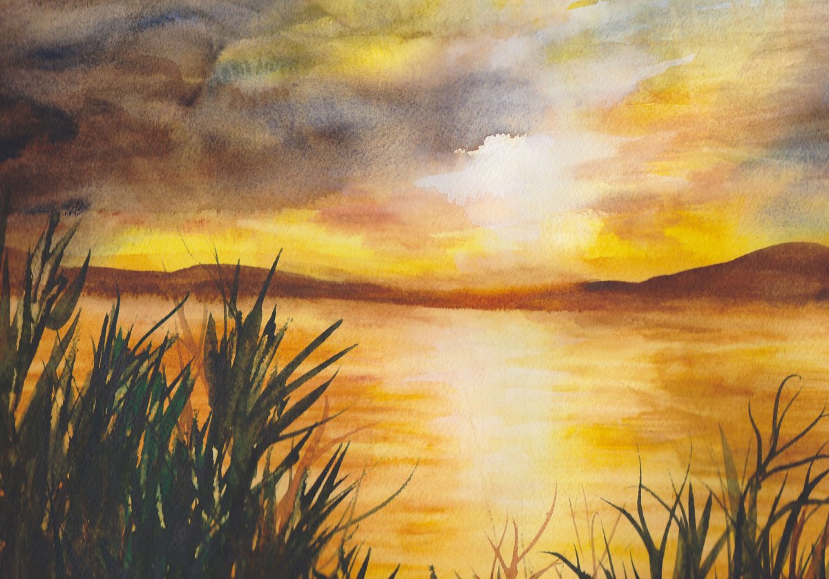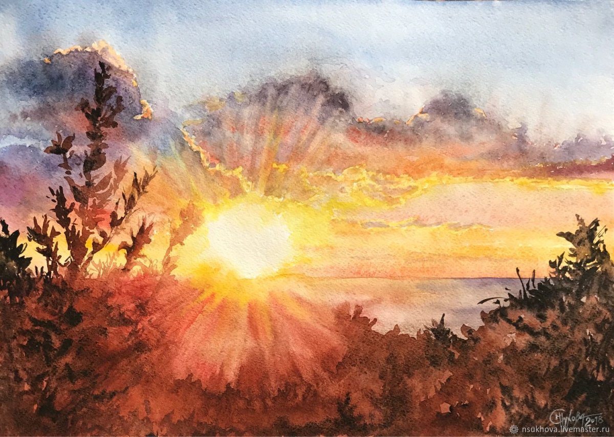 Пейзаж акварелью закат
