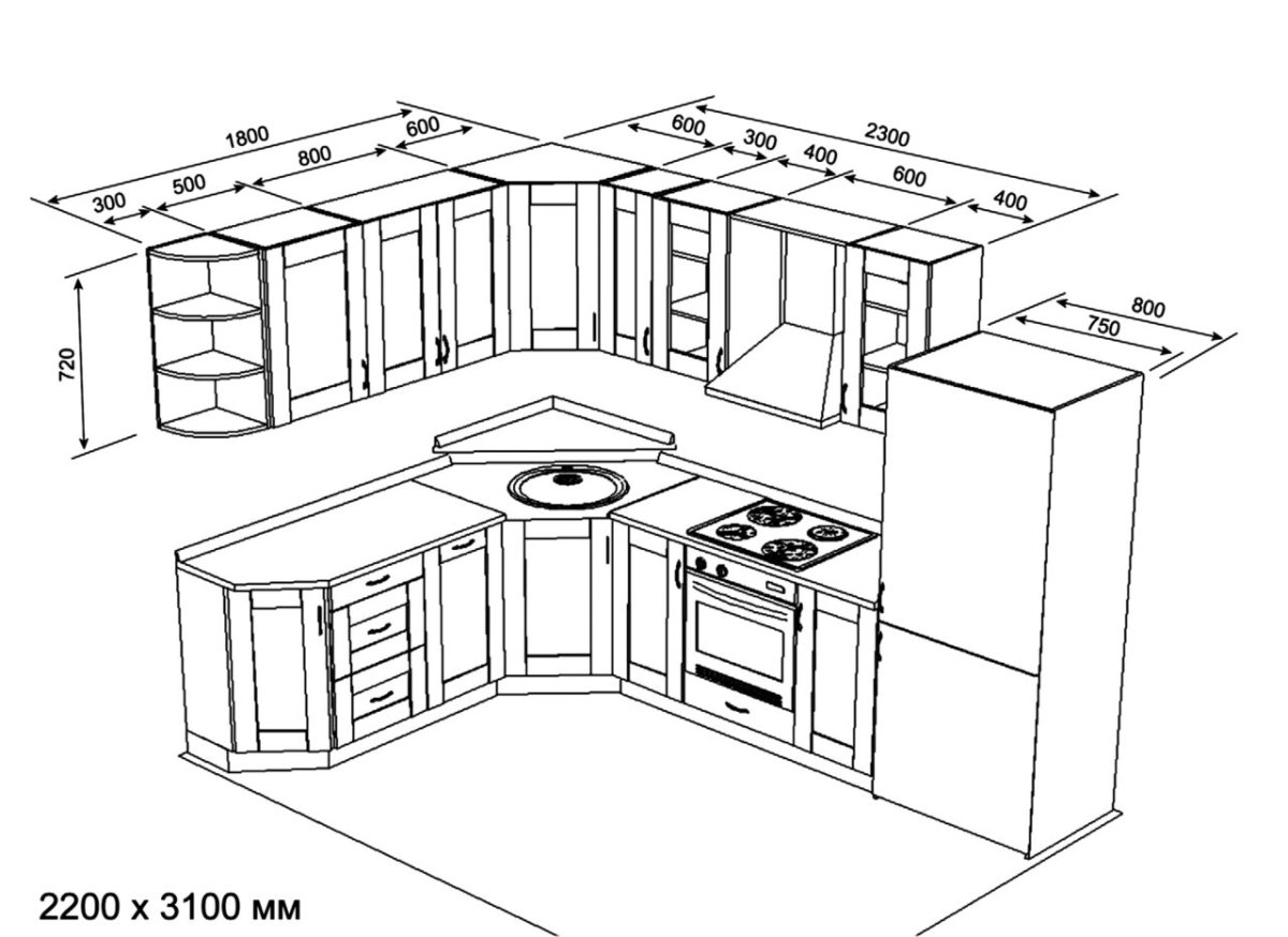 Кухонный мебель угловой 210х200 чертеж с размерами