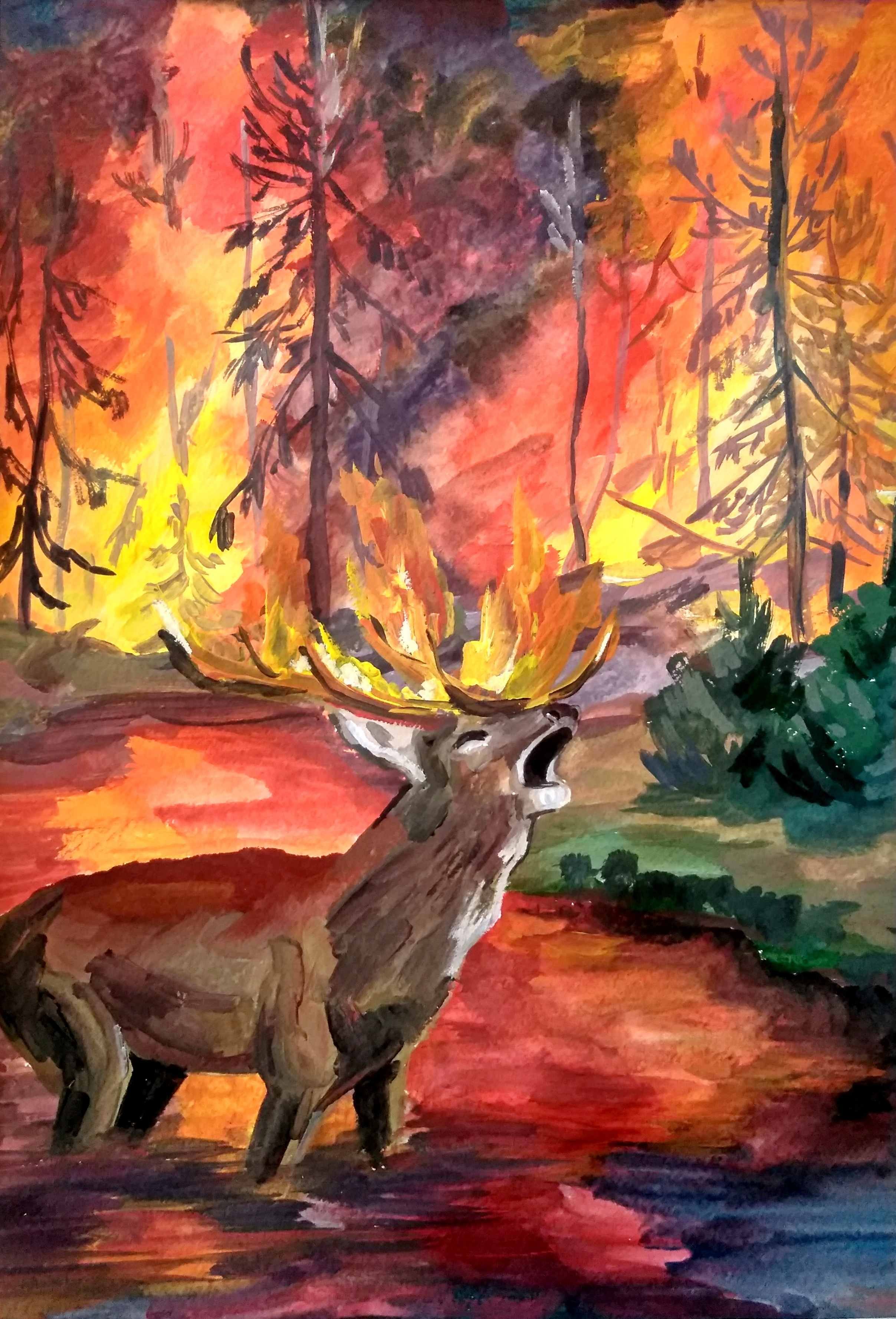 Пожар в лесу гуашью