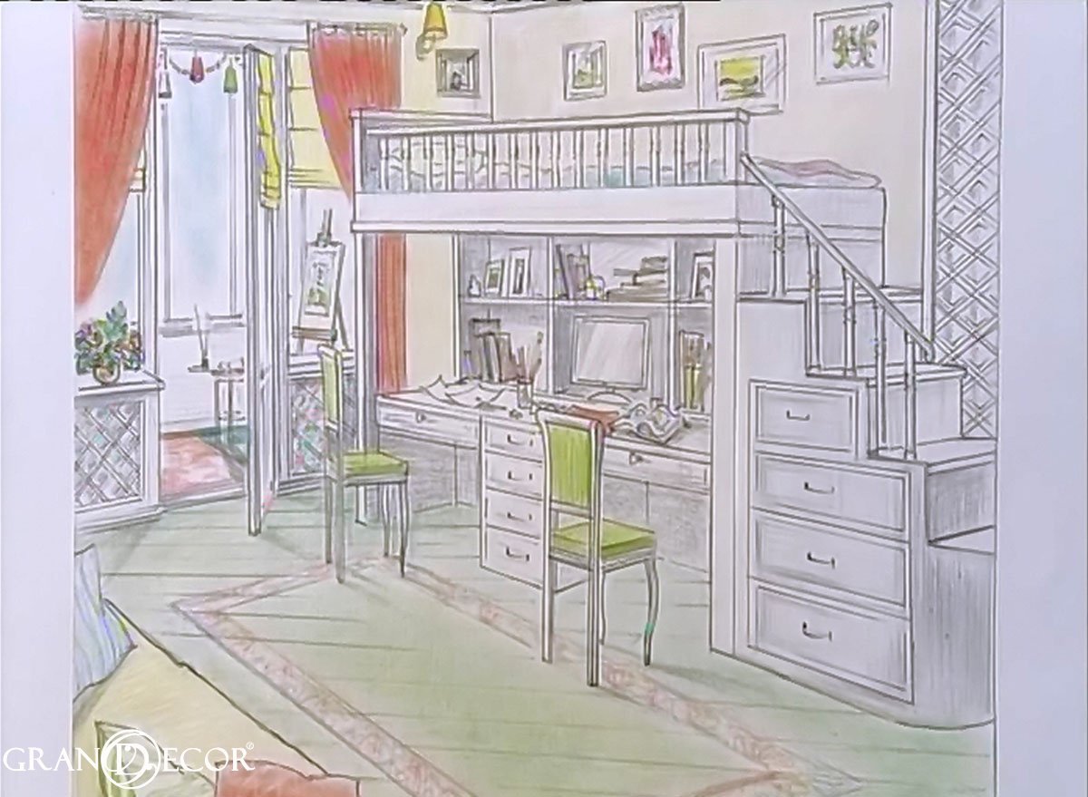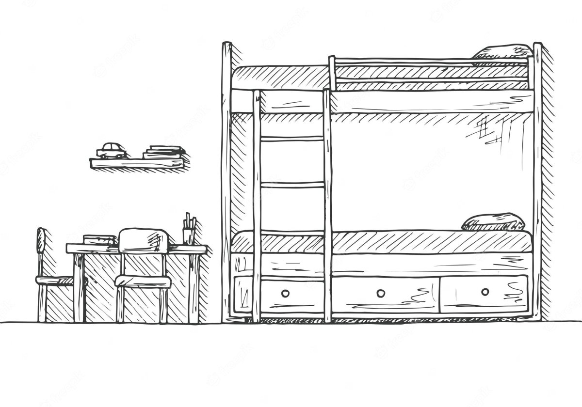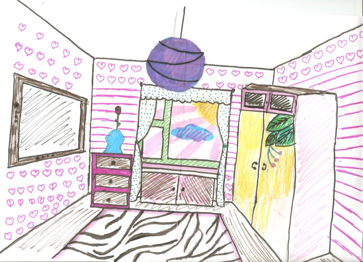 Рисунок детской спальни с мебелью карандашом